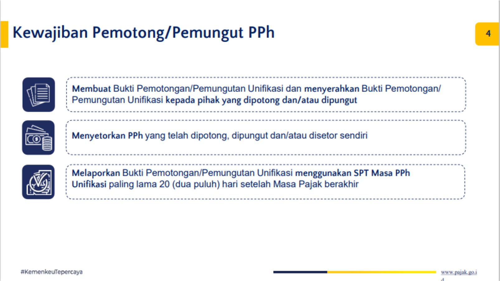 Kelas pajak dibuka pukul 09.00 WIB oleh Fungsional Penyuluh Diah Ayu Trianasari dan dilanjutkan dengan pembahasan materi oleh Fungsional Penyuluh Fransisca Yeni Widyaningsih. Dalam paparannya, Yeni menyampaikan bahwa latar belakang pelaksanaan SPT Masa Unifikasi adalah untuk memudahkan wajib pajak membuat bukti potong yang menerapkan prinsip one-stop application dalam pembuatan dan pelaporan SPT Masa PPh. SPT Masa PPh Unifikasi ini terdiri dari beberapa jenis SPT Masa PPh yaitu PPh Pasal 4 Ayat (2), PPh Pasal 15, PPh Pasal 22, PPh Pasal 23 dan PPh Pasal 26.