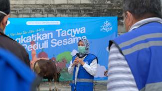 “Tahun pertama kita berkurban, semoga dapat dijadikan momen meningkatkan keimanan dan ketakwaan,” ungkap Erna Sulistyowati saat memberikan sambutan sebelum proses penyembelihan.