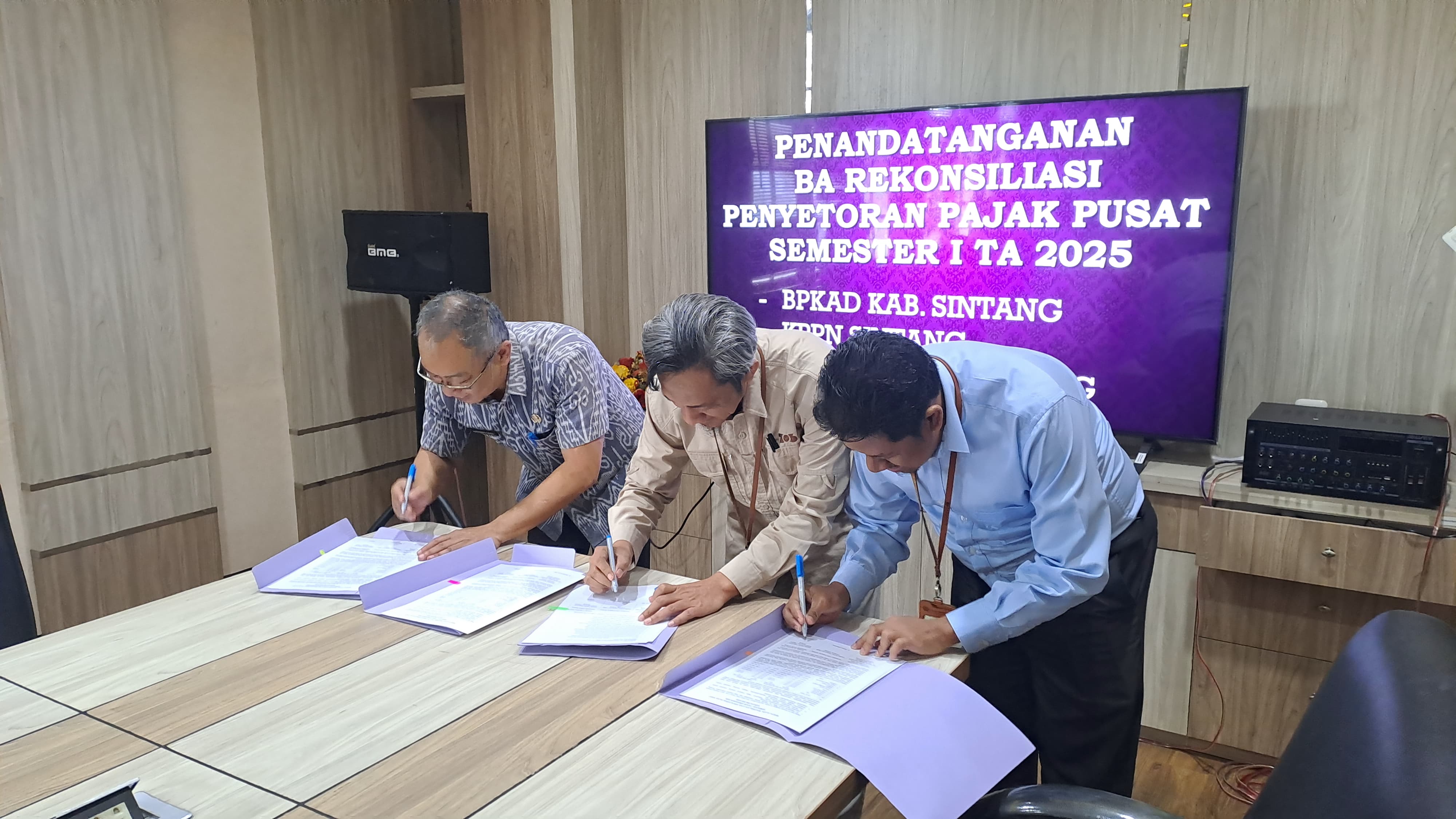 Kepala Kantor Pelayanan Pajak (KPP) Pratama Sintang, S. Sentot Wardoyo menghadiri kegiatan Rekonsiliasi dan Penandatanganan Berita Acara Rekonsiliasi atas Penyetoran Pajak Pusat Semester I Tahun Anggaran 2025 yang diselenggarakan di Kantor Badan Pengelolaan Keuangan dan Aset Daerah (BPKAD) Kabupaten Sintang (Kamis, 7/8).