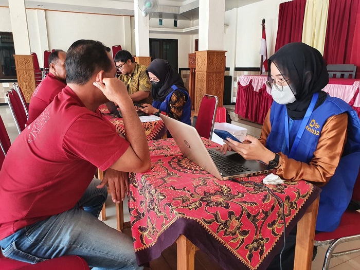 Sad Bambang Permadi, staf Kantor Kecamatan Nguter mendatangi Pojok Pajak Kantor Pelayanan Pajak (KPP) Pratama Sukoharjo di Kantor Kecamatan Nguter, Sukoharjo (Jumat, 9/2). Kehadiran Bambang dilayani oleh Siti Nur Azizah, relawan pajak dari Universitas Duta Bangsa Surakarta yang sedang bertugas di pojok pajak.