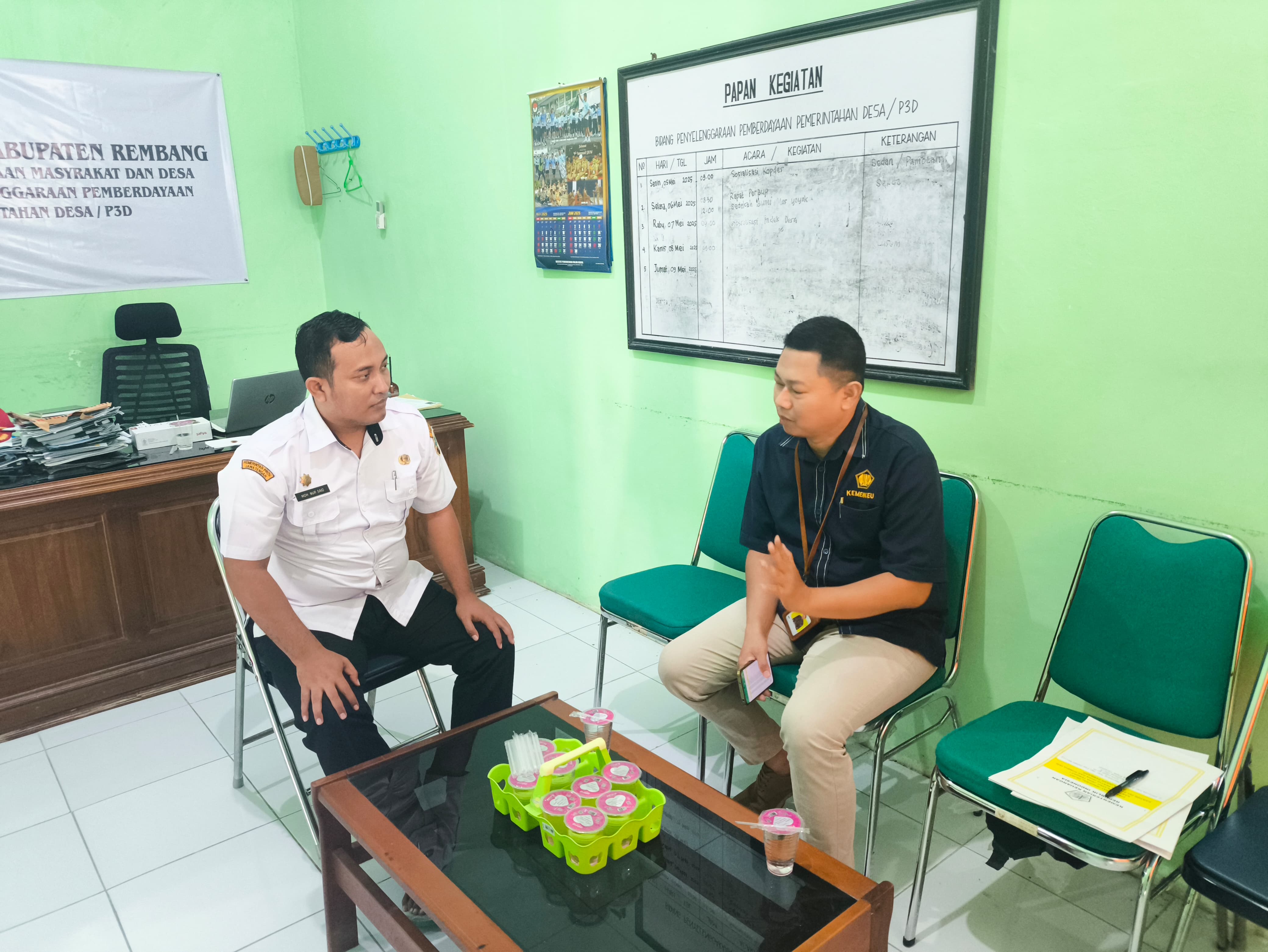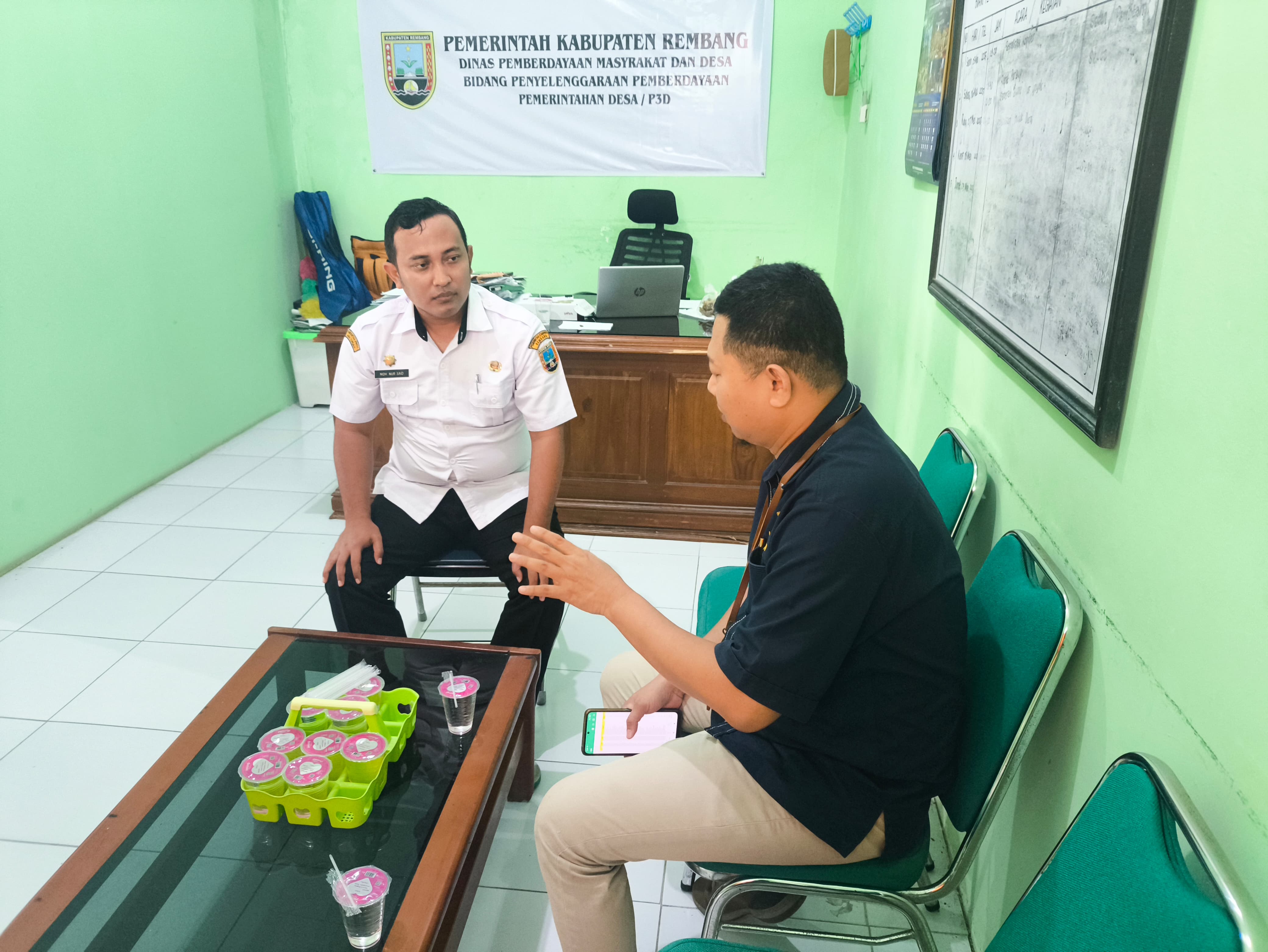 Kepala KP2KP Rembang diterima langsung oleh Kepala Bidang Penyelenggaraan Pemberdayaan Pemerintahan Desa (P3D) Dinas Pemberdayaan Masyarakat dan Desa (Dinpermades) Kabupaten Rembang, Moh. Nur Said, di Ruang Kepala Bidang P3D.