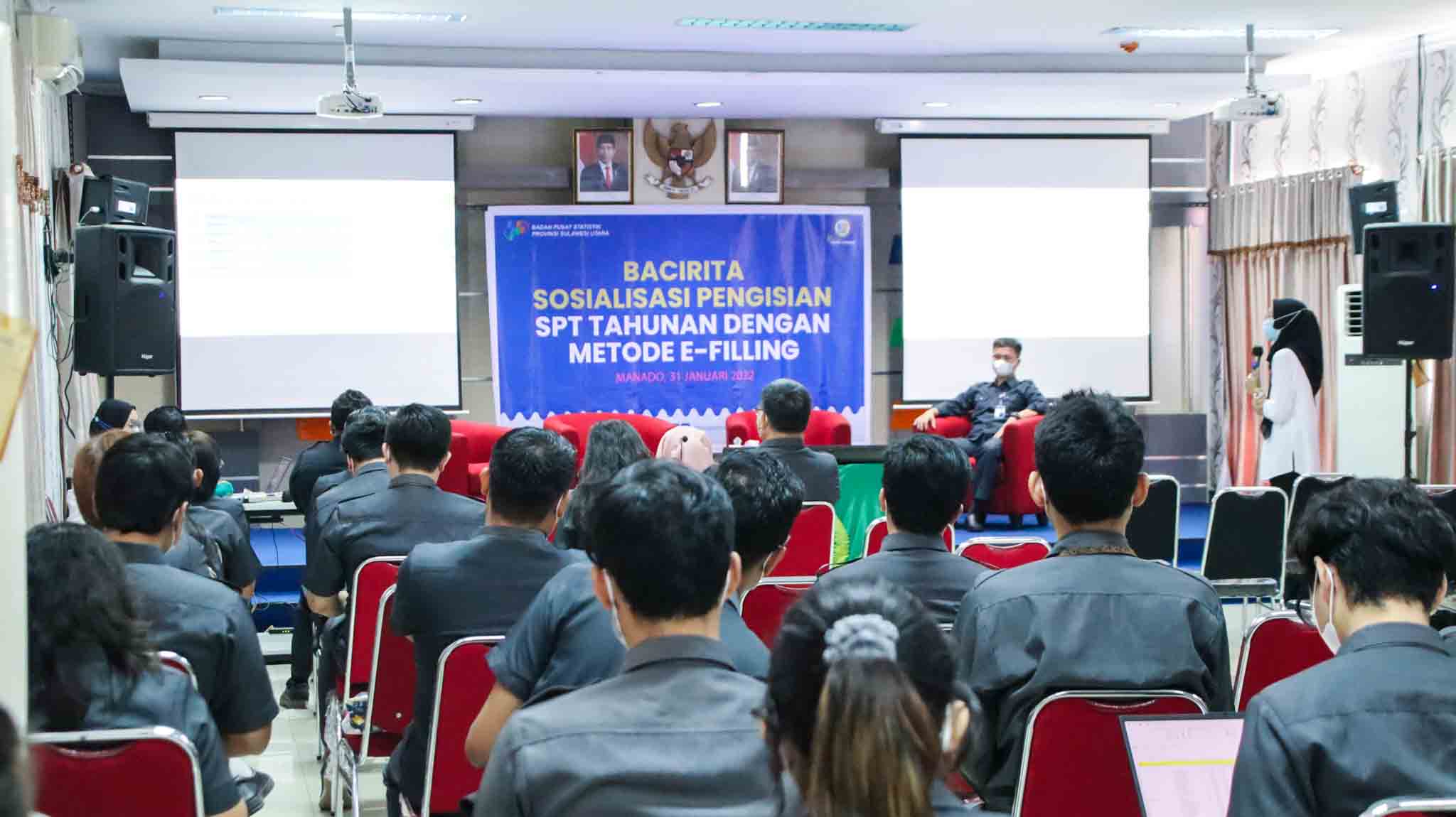 Kantor Pelayanan Pajak (KPP) Pratama Manado menagadakan kegiatan sosialisasi pengisian Surat Pemberitahuan (SPT) Tahunan Pajak Penghasilan (PPh) Wajib Pajak Orang Pribadi (WPOP) bagi Aparatur Sipil Negara (ASN) Badan Pusat Statistik Provinsi Sulawesi Utara (BPS Sulut) bertempat di Aula BPS Sulut, Kota Manado (Seni, 31/1).