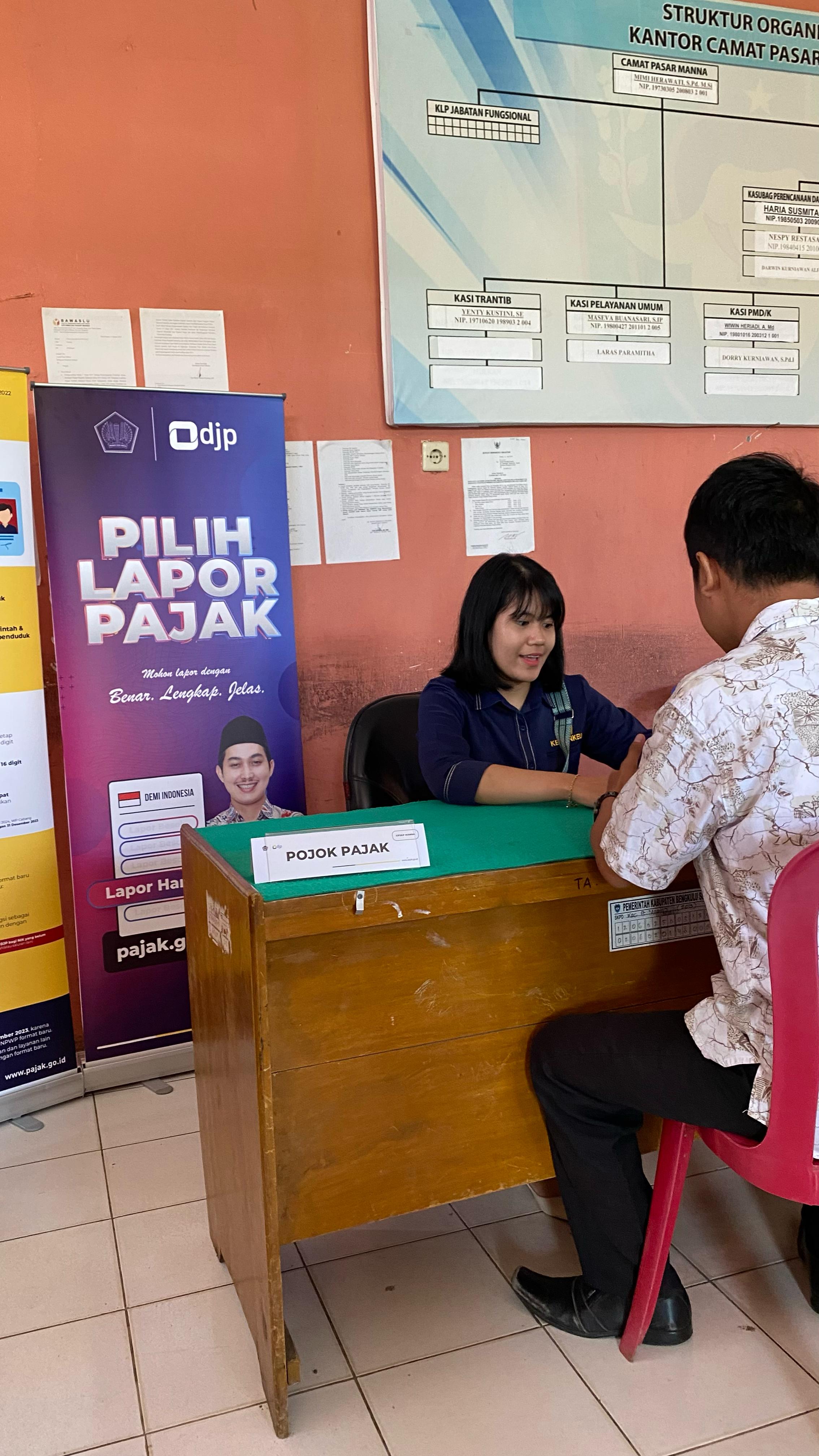 Kantor Pelayanan, Penyuluhan dan Konsultasi Perpajakan (KP2KP) Manna membuka pojok pajak di Kantor Kecamatan Pasar Manna (Rabu, 7/2). Pojok pajak ini diselenggarakan dalam rangka membantu wajib pajak yang merupakan Aparatur Sipil Negara (ASN) yang bertugas di Kantor Kecamatan Pasar Manna untuk dapat melakukan pelaporan Surat Pemberitahuan (SPT) Tahunan sekaligus melakukan pemadanan Nomor Induk Kependudukan (NIK) menjadi Nomor Pokok Wajib Pajak (NPWP).
