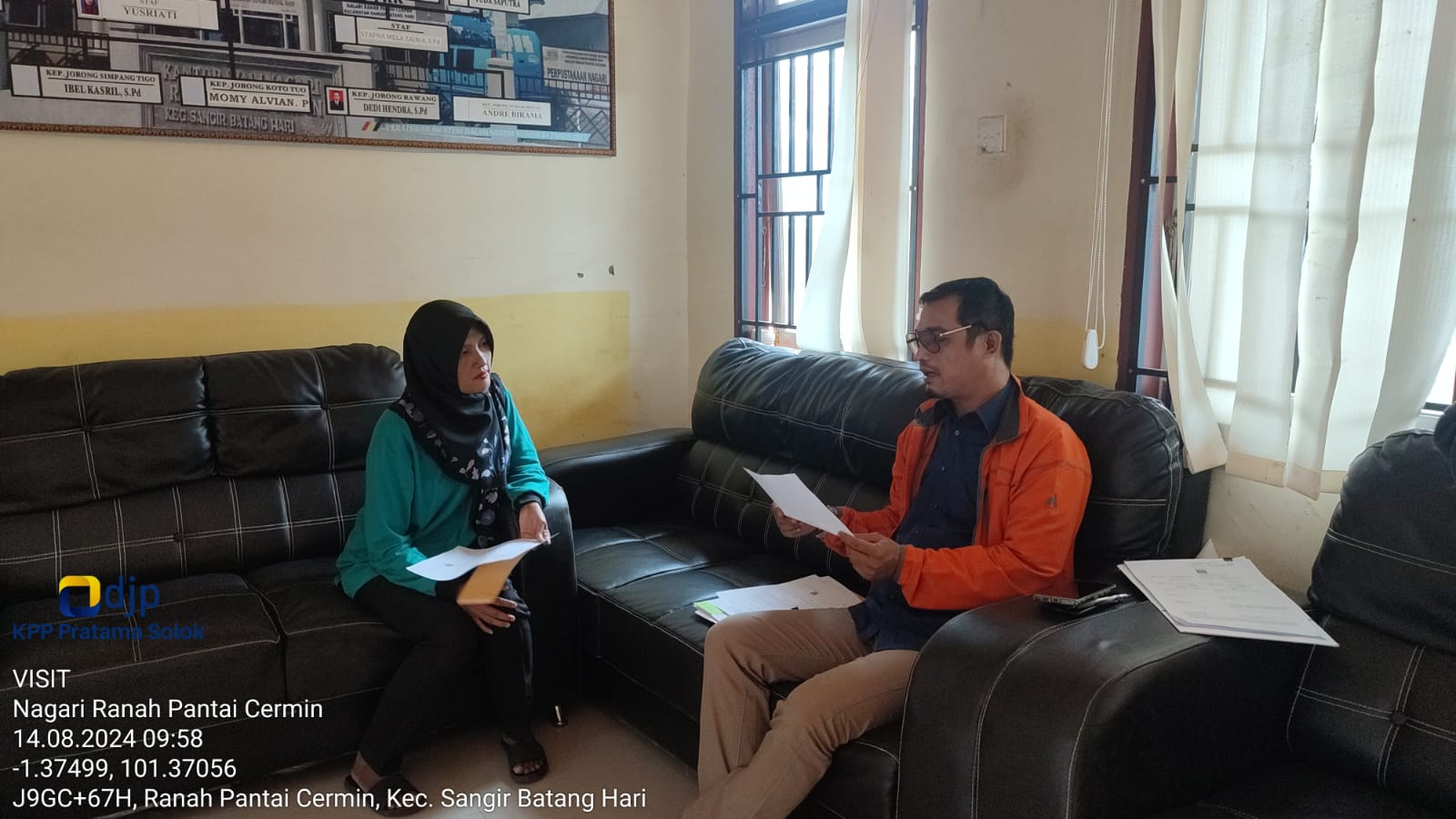 Kantor Pelayanan Pajak (KPP) Pratama Solok melakukan kunjungan ke Kantor Wali Nagari Ranah, Kecamatan Pantai Cermin di Solok (Rabu, 14/8). Kunjungan ini dipimpin Ocvan Anwar Najja, Account Representative Seksi Pengawasan V KPP Pratama Solok. Tim KPP Pratama Solok disambut langsung oleh Wali Nagari Ranah dan Kepala Urusan (Kaur) Bidang Keuangan Nagari.