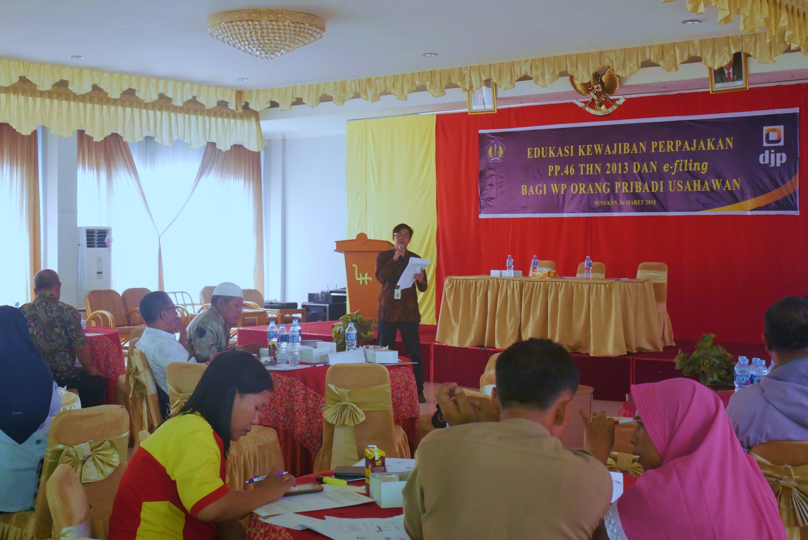 Dalam rangka meningkatkan kepatuhan perpajakan, Kantor Pelayanan, Penyuluhan dan Konsultasi Perpajakan (KP2KP) Nunukan memberikan edukasi mengenai pelaporan SPT Tahunan secara e-filing kepada para pelaku usaha di Nunukan, Selasa (6/3). Bertempat di Ballroom Hotel Laura, Nunukan, kegiatan yang diikuti lebih dari 40 usahawan ini dibuka dengan sambutan Kepala Kantor KP2KP Nunukan Moh Nur Hermawan.