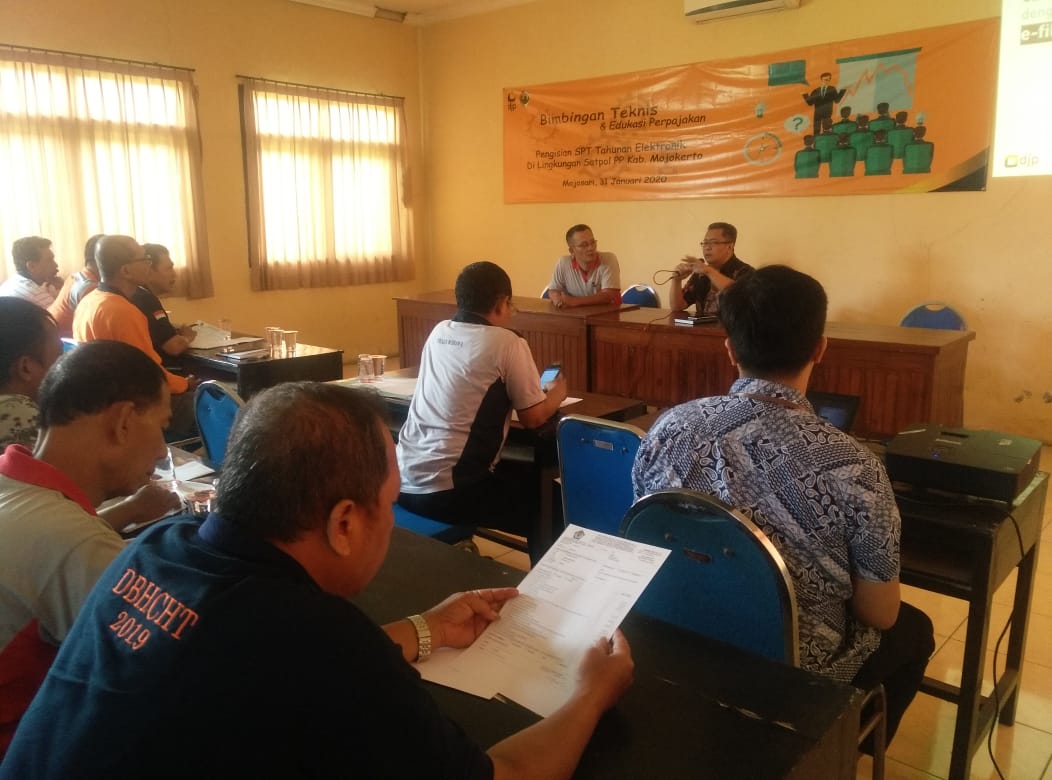 Kantor Pelayanan, Penyuluhan, dan Konsultasi Perpajakan (KP2KP) Mojosari mengadakan kegiatan Bimbingan Teknis dan Edukasi Perpajakan Pengisian SPT Tahunan Elektronik kepada para pegawai Satuan Polisi Pamong Praja (Satpol PP) Kabupaten Mojokerto (Jumat, 31/1). Kegiatan yang bertempat di aula Kantor Satpol PP Kabupaten Mojokerto Jalan Pemuda Nomor 55, Seduri, Mojosari tersebut dimulai pada pukul 09.00 WIB.