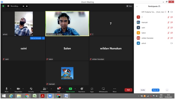Petugas Kantor Pelayanan Penyuluhan dan Konsultasi Perpajakan (KP2KP) Nunukan kembali mengadakan kegiatan sosialisasi Program Pengungkapan Sukarela (PPS) kepada sejumlah wajib pajak secara daring melalui media Zoom di Kab. Nunukan (Selasa, 31/05). Dalam kegiatan ini, terdapat dua orang yang menjadi narasumber, yaitu Adit dan Selamet selaku petugas dari KP2KP Nunukan.