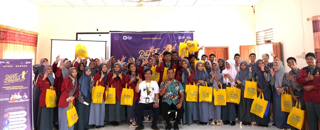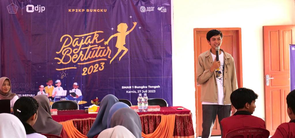 Kantor Pelayanan, Penyuluhan, dan Konsultasi Perpajakan (KP2KP) Bungku kembali melakukan edukasi perpajakan kepada generasi muda melalui kegiatan Pajak Bertutur 2023. Kegiatan dilaksanakan di SMA Negeri (SMAN) 1 Bungku, Kab. Morowali (Kamis, 27/7). Kegiatan kali ini diikuti oleh siswa dari kelas X, XI, maupun XII yang merupakan pengurus Organisasi Siswa Intra Sekolah (OSIS) dari SMAN 1 Bungku.