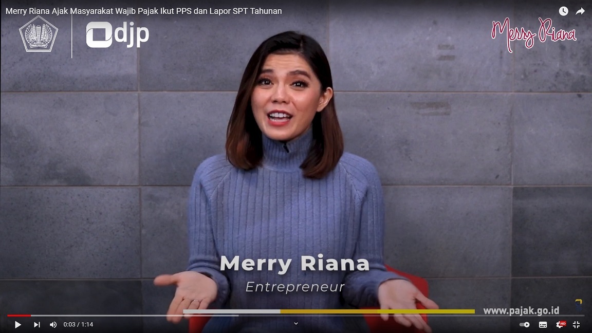 Merry Riana menyampaikan ajakan kepada para wajib pajak untuk memanfaatkan Program Pengungkapan Sukarela (PPS) melalui rekaman vidio dari kantornya di Jakarta Barat yang diunggah di kanal YouTube Kanwil DJP Jakarta Barat (Selasa, 15/3). Tayangan vidio tersebut juga dapat disaksikan melalui Instagram Kantor Wilayah Direktorat Jenderal Pajak Jakarta Barat, @pajakjakbar.
