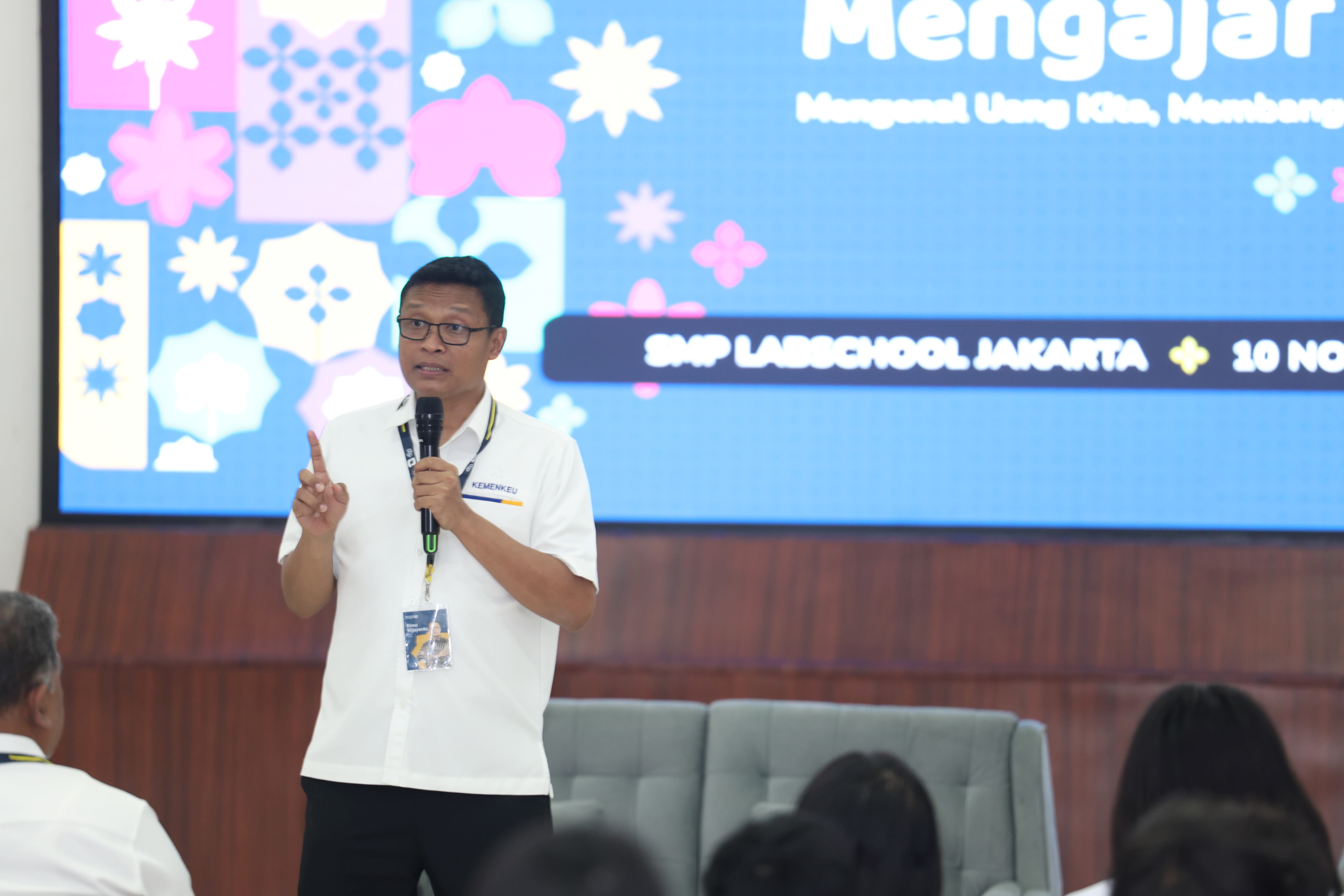 Bimo juga mengisi sesi Kemenkeu Mengajar di Aula SMP Labschool Jakarta. Dalam penyampaian materinya, Bimo menjelaskan bahwa salah satu sumber uang negara berasal dari pajak.