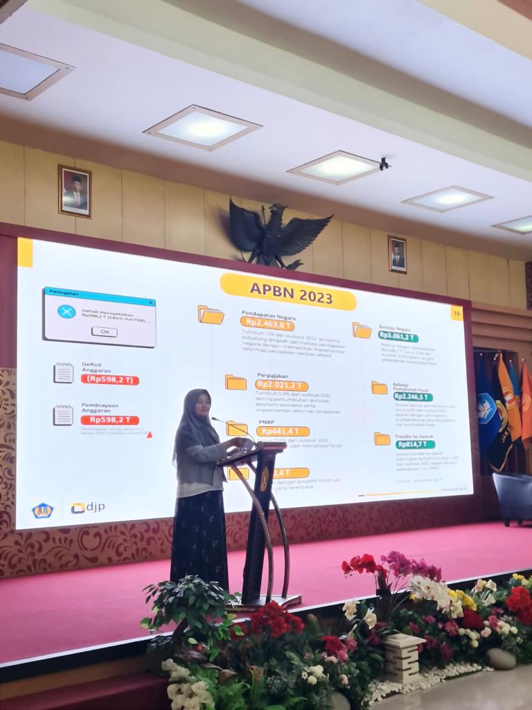 Fungsional Penyuluh Pajak Kantor Wilayah Direktorat Jenderal Pajak (Kanwil DJP) Jawa Barat III sampaikan peran pajak dalam menghadapi ancaman resesi global. Lala Krisnalia menyampaikan kepada 500 peserta Taxpression National Seminar 2023 yang digelar Universitas Pembangunan Negeri (UPN) Veteran Jakarta di Auditorium Bhineka Tunggal Ika Gedung Jenderal Soedirman, Jakarta (Sabtu, 5/9).