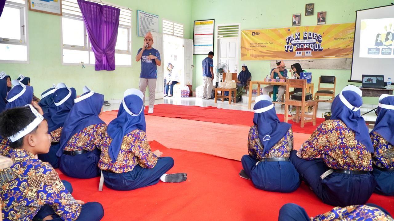 Kantor Pelayanan Penyuluhan dan Konsultasi Perpajakan (KP2KP) Empat Lawang menggelar kegiatan Tax Goes To School (TGTS) di Sekolah Menengah Pertama (SMP) Negeri 2 Tebing Tinggi dengan tema “Generasi Muda Sadar Pajak, Bukti Peduli Pada Negeri”. Kegiatan dilaksanakan di ruang kelas SMP Negeri 2 Tebing Tinggi dan diikuti oleh 30 siswa, Empat Lawang, Sumatera Selatan (31/7).