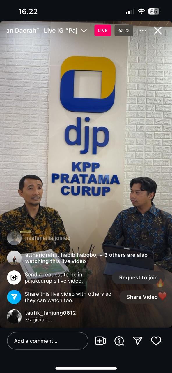 Kantor Pelayanan Pajak (KPP) Pratama Curup kembali meluncurkan siaran langsung melalui akun Instagram resmi KPP Pratama Curup bertajuk Pajak Untuk Pembangunan Daerah (Jumat, 21/03).