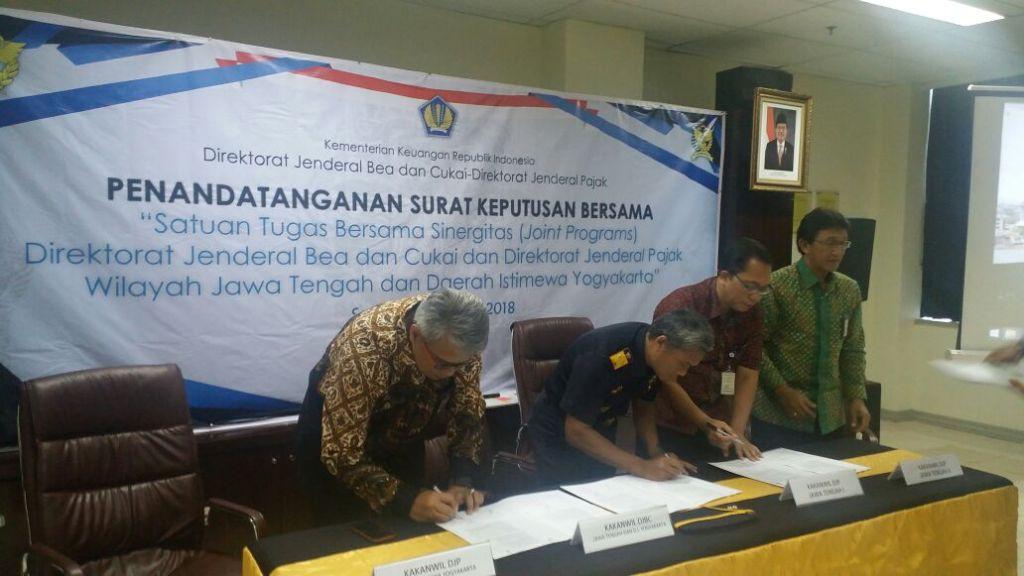 Kantor Wilayah Direktorat Jenderal Pajak di Lingkungan Jawa Tengan dan Dearah Istimewa Yogyakarta bersama Kanwil DJBC Jateng dan DIY telah membentuk Satuan Tugas Bersama dalam rangka mengoptimalkan penerimaan Pajak, Bea Masuk, Bea Keluar dan Cukai di wilayah Jateng dan DIY (Jumat, 13/4). Adapun tujuan dari semua itu adalah untuk meningkatkan penerimaan negara, dan meningkatkan pengetahuan sumber daya SDM. Bertempat di Kanwil DJBC Jateng dan DIY, Kepala Kanwil DJP Jawa Tengan I, Kepala Kanwil DJP Jawa Tengah II dan Kepala Kanwil DJP Daerah Istimewa Yogyakarta, bersama Kepala Kanwil DJBC Jateng dan DIY telah membentuk Satuan Tugas Bersama untuk melakukan 4 (empat) hal sebagai berikut :