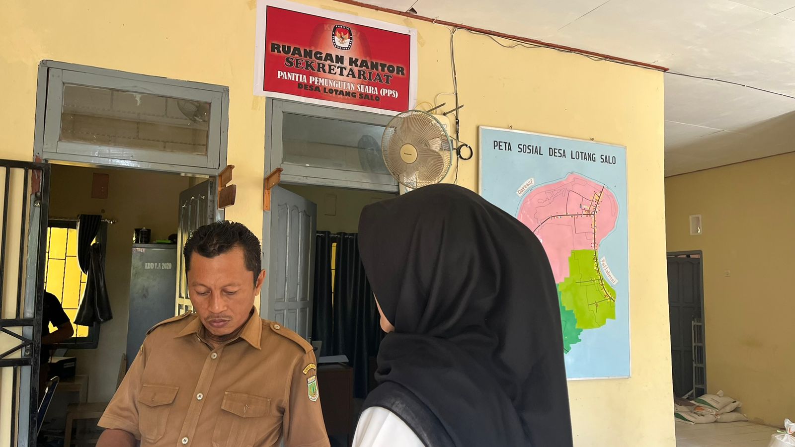 Putri Syahnaz Hanindira, petugas KP2KP Pinrang, mendatangi salah satu wajib pajak pedagang eceran pakaian yang masuk dalam DSPT. Syahnaz mendatangi Kantor Desa Lotang Salo untuk menanyakan alamat yang tercantum dalam basis data Direktorat Jendral Pajak (DJP).