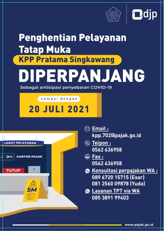 Kantor Pelayanan Pajak (KPP) Pratama Singkawang memberhentikan sementara layanan tatap muka. “Sebelumnya layanan ditutup sampai tanggal 9 Juli 2021. Namun kita perpanjang hingga 20 Juli 2021 mengingat banyak rekan kita yang juga positif Covid-19,” ujar Devie Wachyu Ferrarie Kepala Subbagian Umum dan Kepatuhan Internal KPP Pratama Singkawang (Senin, 12/7).
