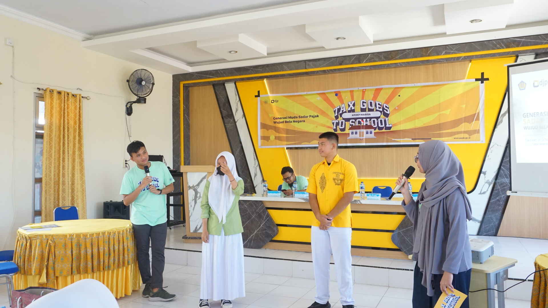 Kantor Pelayanan, Penyuluhan, dan Konsultasi Perpajakan (KP2KP) Marisa menyelenggarakan kegiatan Tax Goes To School (TGTS) secara langsung (luring) di Sekolah Menengah Atas (SMA) Negeri 1 Marisa, Pohuwato, Gorontalo (Kamis, 15/6). Bertempat di Aula SMA Negeri 1 Marisa, kegiatan ini diikuti oleh tiga puluh siswa dan siswi dari kelas sepuluh dan sebelas sekolah tersebut.