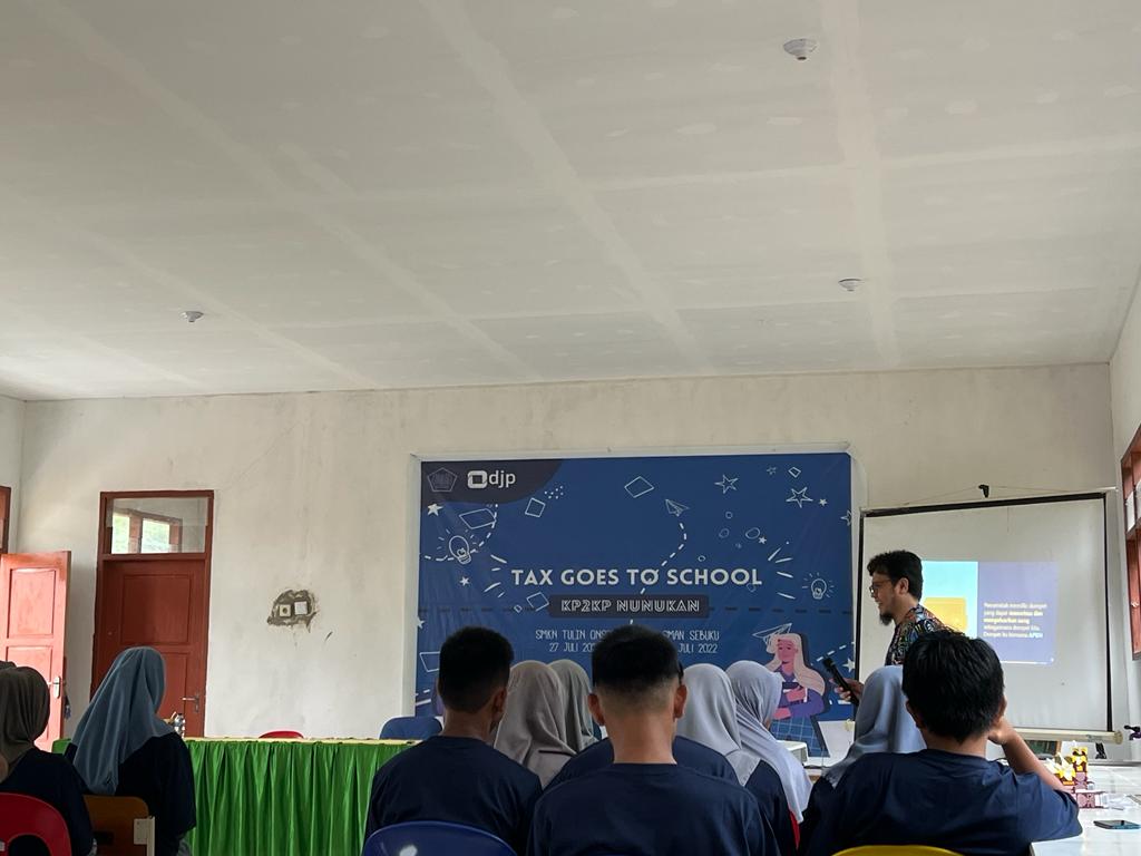 Petugas Kantor Pelayanan, Penyuluhan, dan Konsultasi Perpajakan (KP2KP) Nunukan melakukan sosialisasi perpajakan kepada siswa Sekolah Menengah Atas Negeri (SMAN) 1 Sebuku di Kab. Nunukan (Kamis, 28/7). Kegiatan sosialisasi ini dilakukan dalam rangka pelaksanaan kegiatan Tax Goes To School (TGTS). TGTS di SMAN 1 Sebuku ini merupakan hari kedua dari rangkaian kegiatan sosialisasi KP2KP Nunukan yang diselenggarakan selama dua hari, yakni mulai Rabu, 27 Juli, hingga Kamis, 28 Juli 2022.