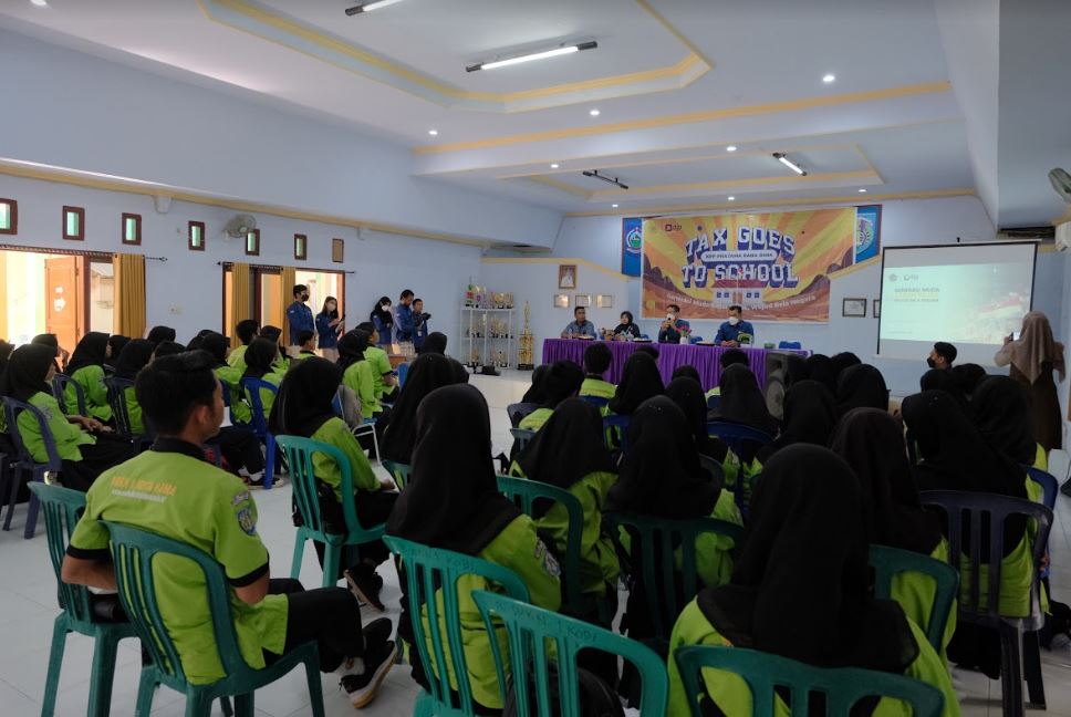 Puluhan siswa SMKN 1 Kota Bima berkumpul di aula sekolah menyambut kunjungan KPP Pratama Raba Bima dalam rangka kegiatan Tax Goes To School 2022 (Kamis, 15/9).