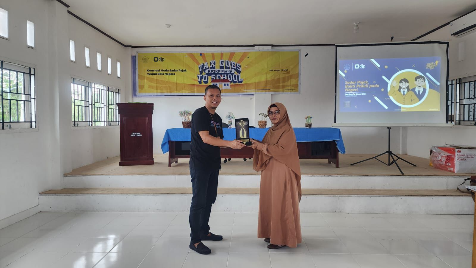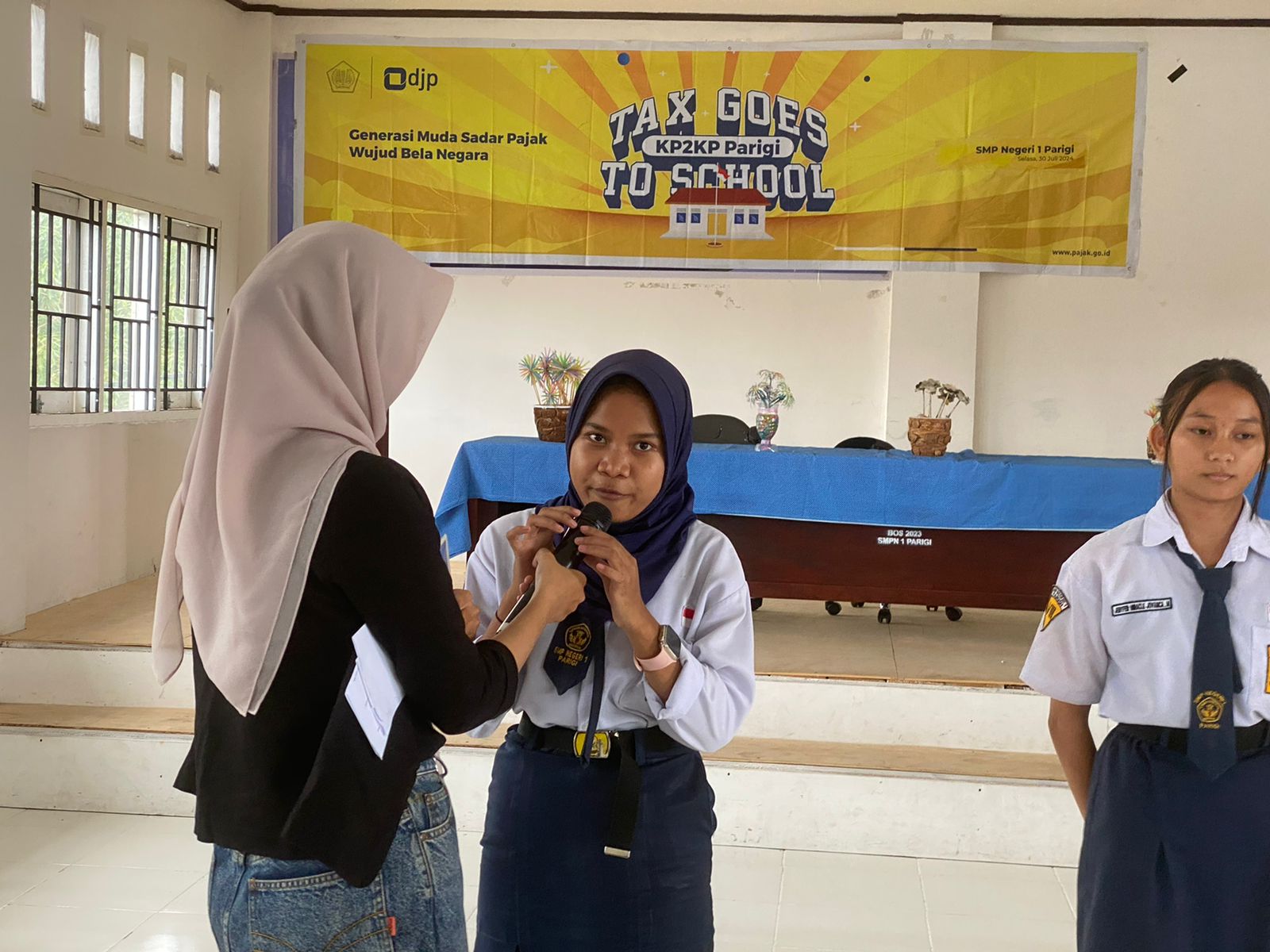 Kantor Pelayanan, Penyuluhan, dan Konsultasi Perpajakan (KP2KP) Parigi menyelenggarakan kegiatan Tax Goes to School (TGTS) 2024 di SMP Negeri (SMPN) 1 Parigi, Kabupaten Parigi Moutong (Selasa, 30/7). Kegiatan ini diikuti secara antusias oleh 60 perwakilan siswa/i SMPN 1 Parigi. Kegiatan ini juga dihadiri oleh Wakil Kepala Sekolah SMPN 1 Parigi dan beberapa perwakilan dewan guru.