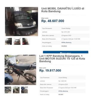 Menurut Hikmat, aset yang akan dilelang adalah satu unit mobil dengan nilai limit sebesar Rp48.607.000,00 dan uang jaminan sebesar Rp9.721.400,00. Selain itu aset yang akan dilelang adalah satu unit sepeda motor dengan nilai limir sebesar Rp19.817.000,00 dan uang jaminan sebesar Rp3.963.400,00.