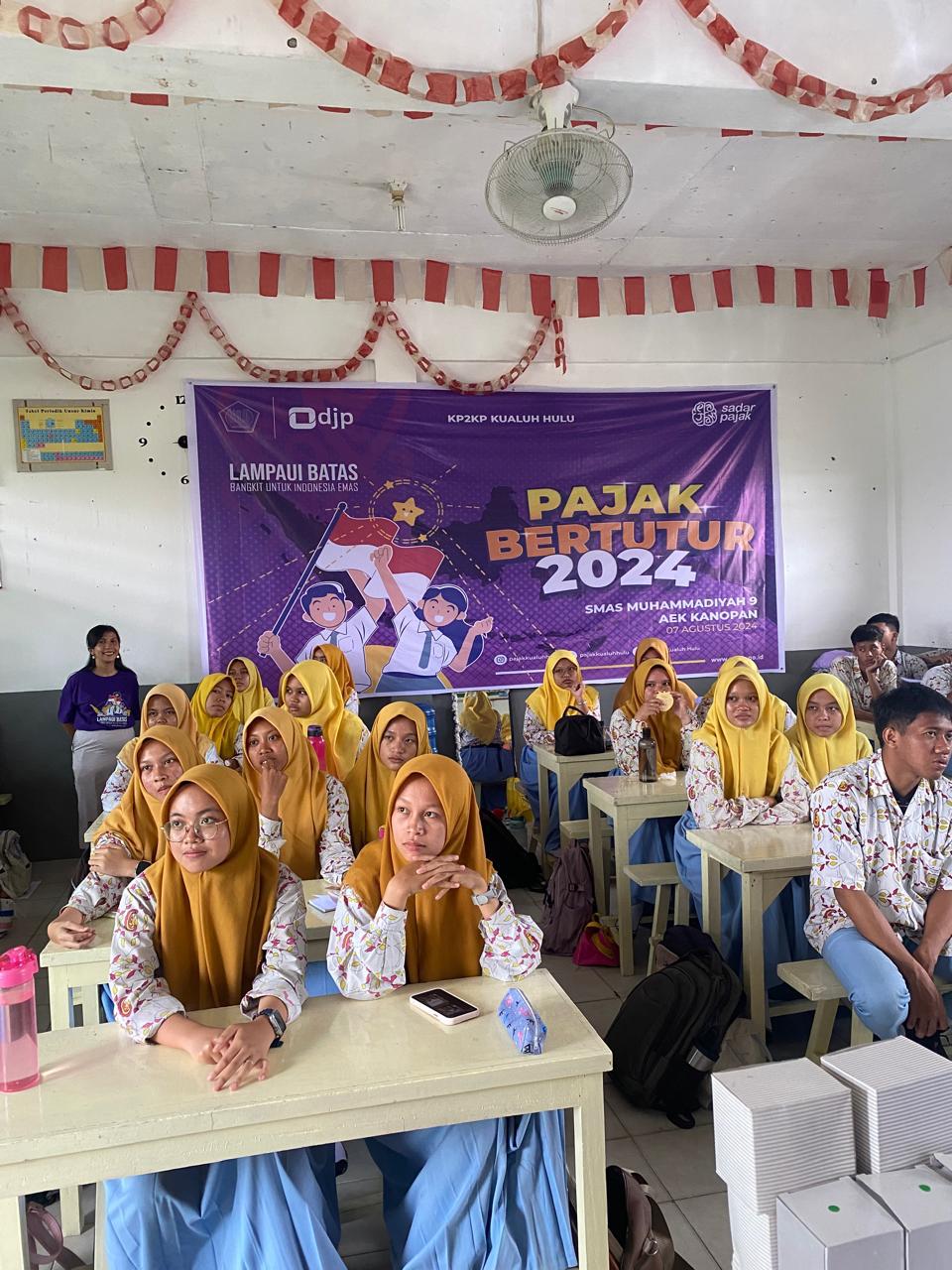 “Lampaui Batas Bangkit untuk Indonesia Emas!” demikian teriakan 40 siswa siswi Sekolah Menengah Atas (SMA) Swasta Muhammadiyah 9 Aek Kanopan sebagai bentuk semangat motivasi diri pada acara Pajak Bertutur 2024 (Rabu, 7/8). Pajak Bertutur merupakan kegiatan edukasi perpajakan kepada generasi muda yang dilakukan oleh Pegawai DJP dengan maksud memberikan kesadaran akan pentingnya pajak bagi kehidupan negara.