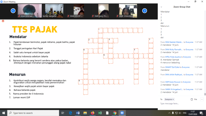 KPP Pratama Balikpapan Barat bersama dengan Kanwil DJP Kalimantan Timur dan Utara serta seluruh unit KPP di wilayah Kalimantan Timur dan Utara menyelenggarakan Pajak Bertutur melalui Zoom Meeting di Balikpapan (Rabu, 15/7). Dengan mengusung tema “Penguatan Karakter Generasi Emas Cerdas dan Sadar Pajak (Bangkit Bersama Pajak)” kegiatan ini diikuti oleh 233 siswa SMP dan SMA dari berbagai wilayah Kalimantan Timur dan Utara.