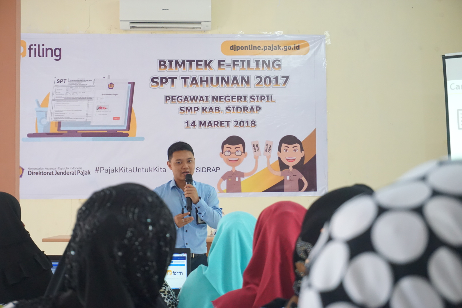 Untuk meningkatkan kesadaran wajib pajak dalam melaporkan SPT Tahunan melalui e-filing, Kantor Pelayanan Penyuluhan dan Konsultasi Perpajakan (KP2KP) Sidrap mengadakan edukasi perpajakan e-filing di Aula KP2KP Sidrap dengan mengundang semua perwakilan SMP se-Kabupaten Sidrap (Rabu, 14/03). Acara ini diselenggarakan sebagai tindak lanjut dari pembicaraan antara Kepala KP2KP dengan perwakilan SMP yang menyampaikan perlunya penyuluhan kepada semua SMP tentang e-filing. Berkat kerjasama dan koordinasi dengan Dinas Pendidikan Kabupaten Sidrap informasi kegiatan edukasi ini segera sampai ke semua SMP se-Kabupaten Sidrap.