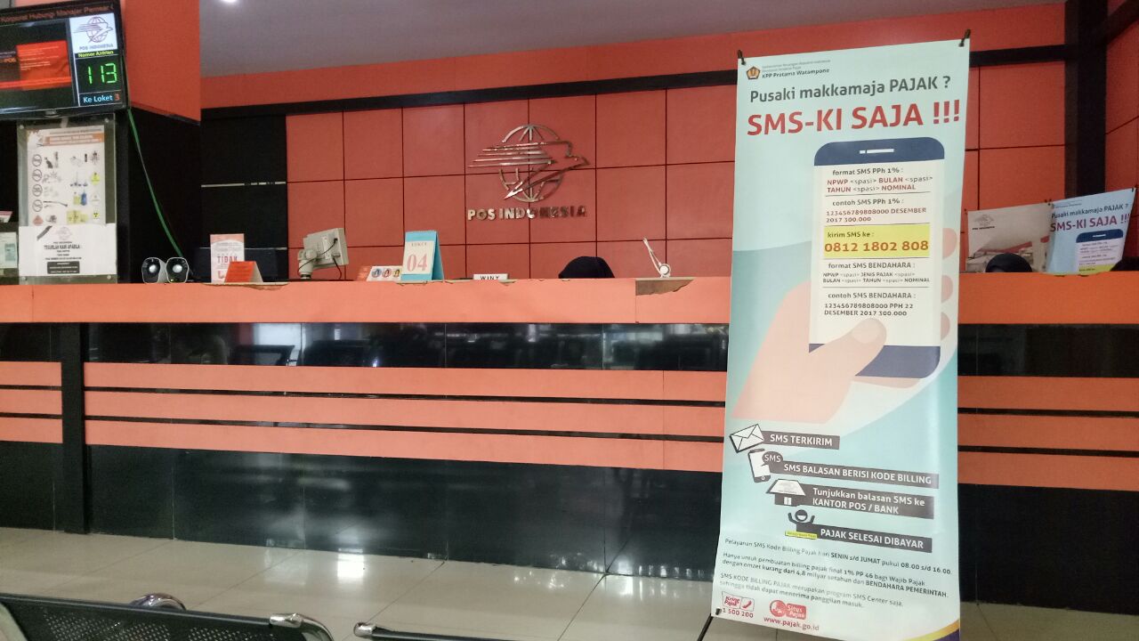 Selain memberikan informasi pada saat pelaporan, KPP Pratama Watampone juga menjalin kerja sama dengan pihak kantor pos di kabupaten Bone dengan memasang X Banner mengenai SMS Billing Center. ini bertujuan untuk menyosialisasikan kemudahan SMS Billing Center.