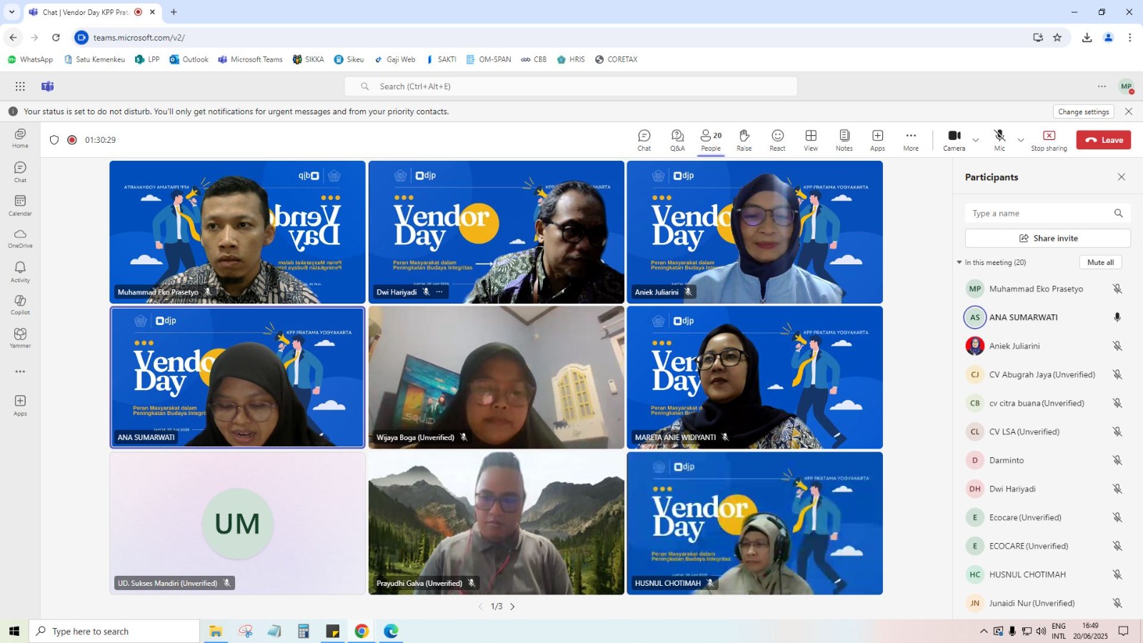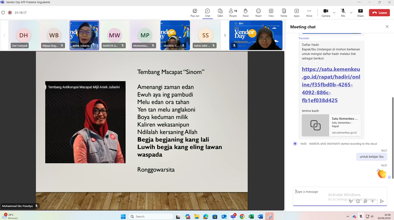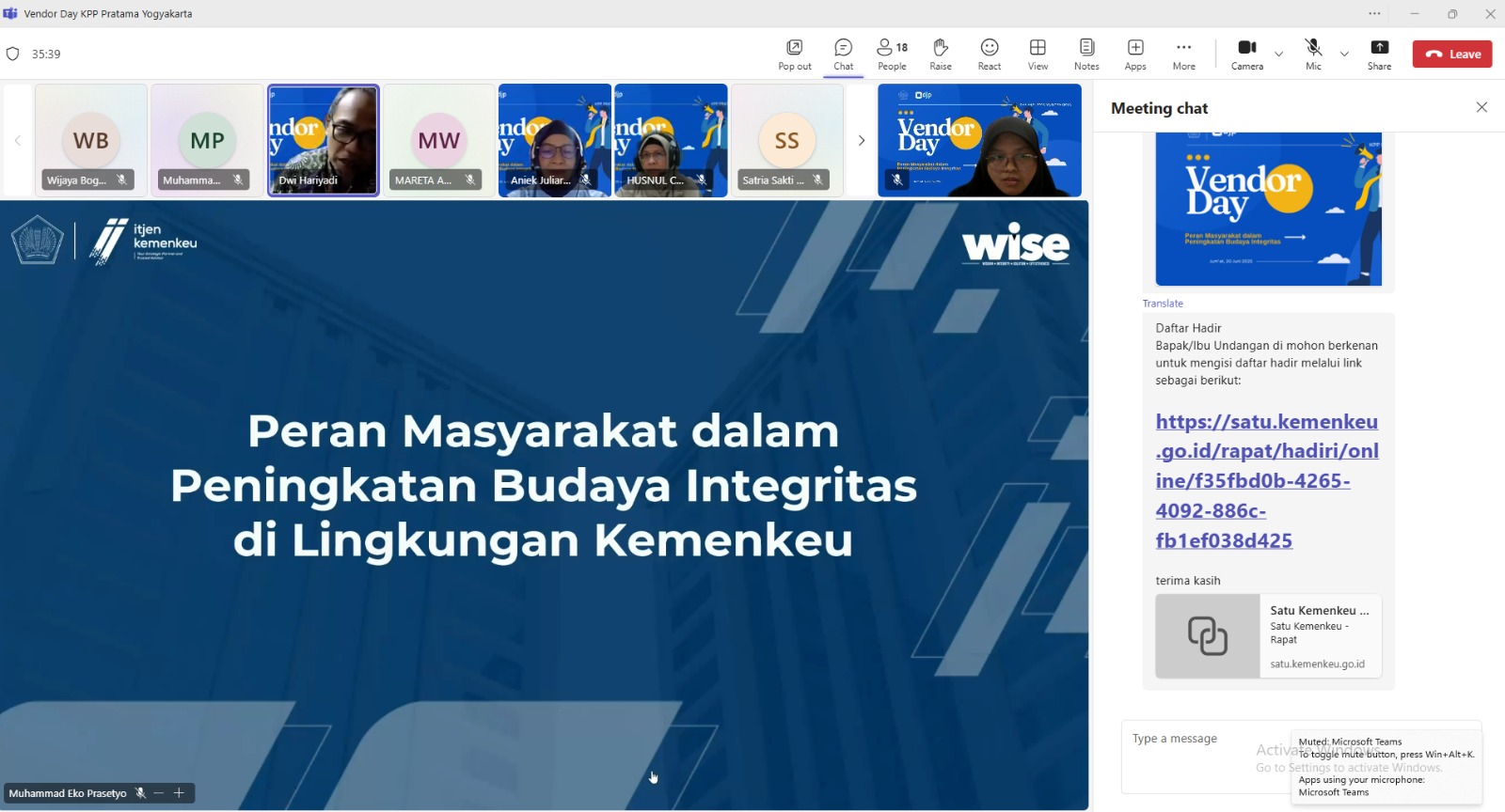 Kegiatan Vendor Day mengusung tema “Peran Masyarakat dalam Peningkatan Budaya Integritas”. Dengan pelaksanaan secara dalam jaringan melalui Teams Meeting, kegiatan ini berhasil menghadirkan 14 rekanan vendor yang telah bekerja sama dengan KPP Pratama Yogyakarta sepanjang tahun 2024 sampai dengan 2025.