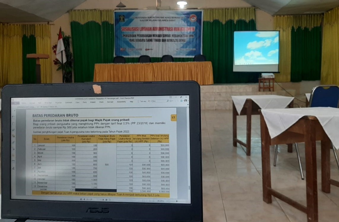 Kantor Pelayanan, Penyuluhan, dan Konsultasi Perpajakan (KP2KP) Mamasa menjadi pembicara dalam sosialisasi Perseroan Perorangan yang diadakan Kantor Wilayah Kementerian Hukum dan HAM Sulawesi Barat (Kanwil Kemenkumham Sulbar) di Auditorium Hotel Matana II, Jalan Poros Polewali-Mamasa (Senin, 21/2). Dalam sosialisasi tersebut, KP2KP Mamasa memaparkan berbagai insentif pajak yang diberikan pemerintah untuk Usaha Mikro, Kecil, dan Menengah (UMKM).