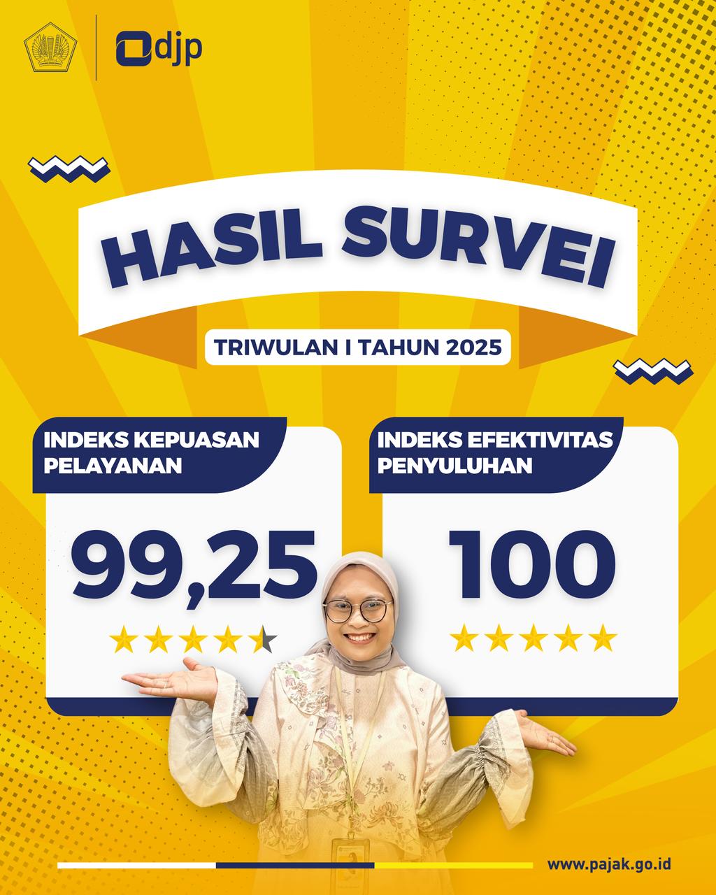 Berdasarkan hasil Survei Kepuasan Masyarakat Triwulan I tahun 2025, Kantor Pelayanan Pajak (KPP) Pratama Semarang Selatan meraih Indeks Kepuasan Pelayanan dengan nilai 99,25. Angka ini menunjukkan tingkat kepuasan yang sangat tinggi dari para wajib pajak terhadap layanan yang diberikan oleh KPP Pratama Semarang Selatan di Kota Semarang (Selasa, 29/4).