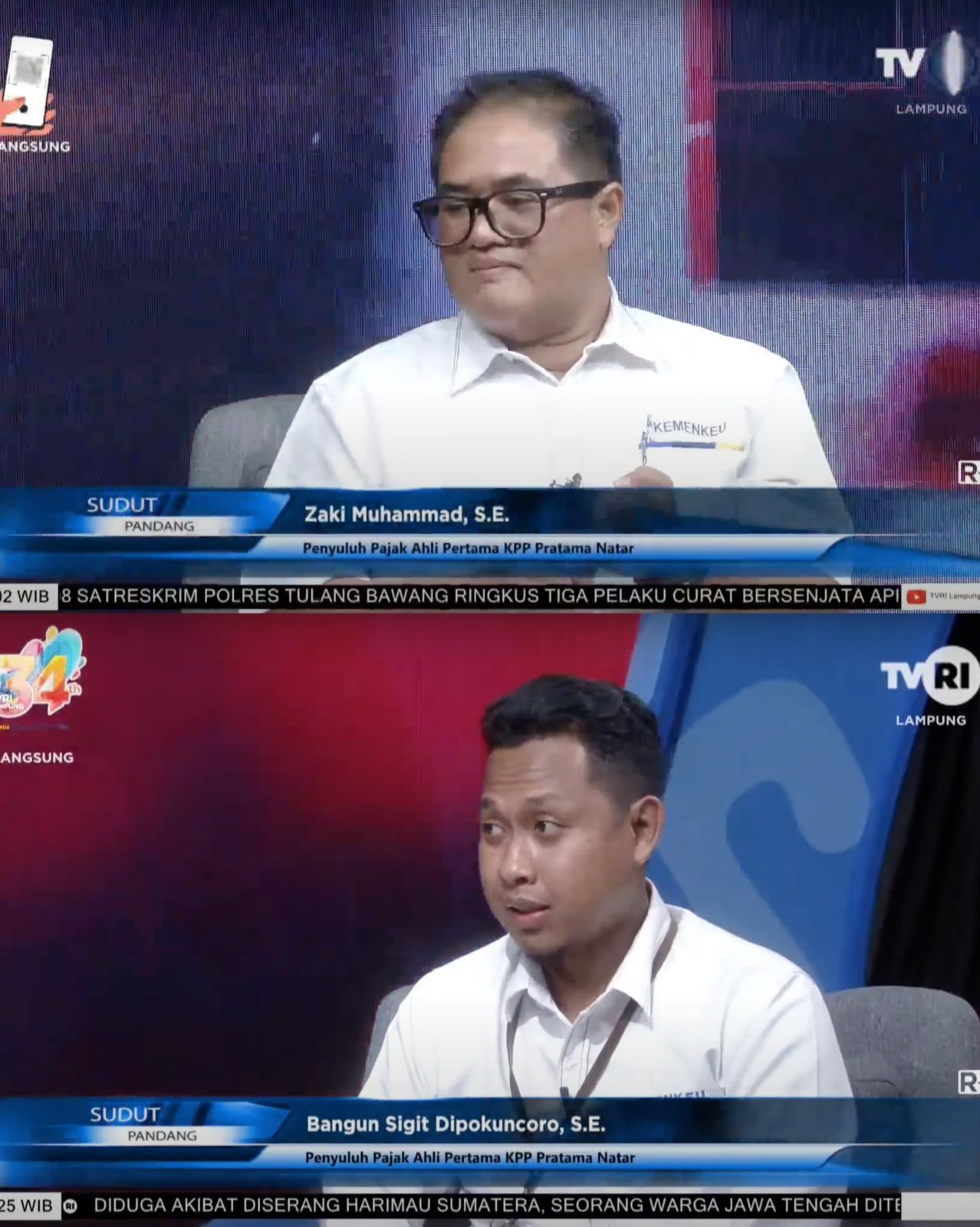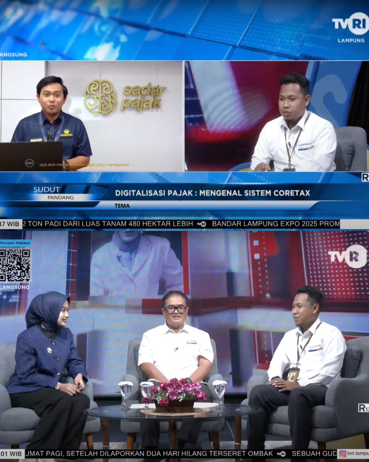 Kantor Pelayanan Pajak (KPP) Pratama Natar melaksanakan kegiatan edukasi perpajakan melalui media yang lebih luas dan menjangkau masyarakat umum secara tidak langsung melalui siaran televisi lokal. Kali ini, edukasi disampaikan dalam bentuk talkshow interaktif bertajuk “Digitalisasi Pajak: Mengenal Sistem Coretax” yang ditayangkan secara langsung oleh Televisi Republik Indonesia (TVRI) Lampung dalam program Sudut Pandang pukul 14.00–15.00 WIB. Siaran ini juga dapat disaksikan ulang melalui kanal YouTube TVRI Lampung Live (Senin, 14/7).