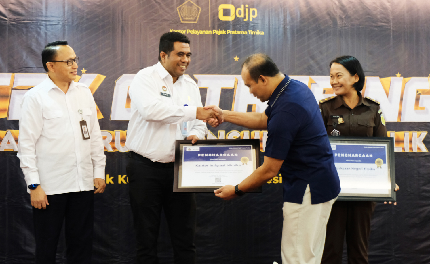 Di akhir acara, kepala KPP Pratama Timika memberikan penghargaan kepada para Wajib Pajak, instansi Pemerintah Daerah, dan Instansi Vertikal lainnya atas kontribusi, dukungan, sinergitas, dan kerja sama dalam pencapaian kinerja Kantor Pelayanan Pajak Pratama Timika tahun 2023.