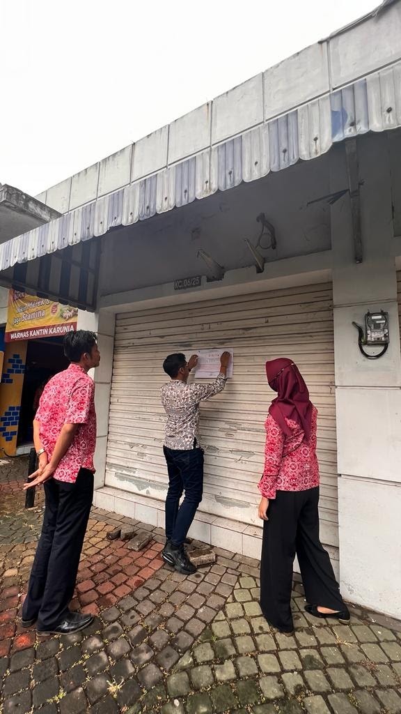 Juru Sita Kantor Pelayanan Pajak (KPP) Pratama Tangerang Barat Indra melakukan prosedur penagihan utang pajak melalui tahapan penyitaan aset wajib pajak dengan menempelkan segel sita di beberapa kios yang bertempat di Mardigrass Citra Raya Kota Tangerang (Jumat, 22/7).