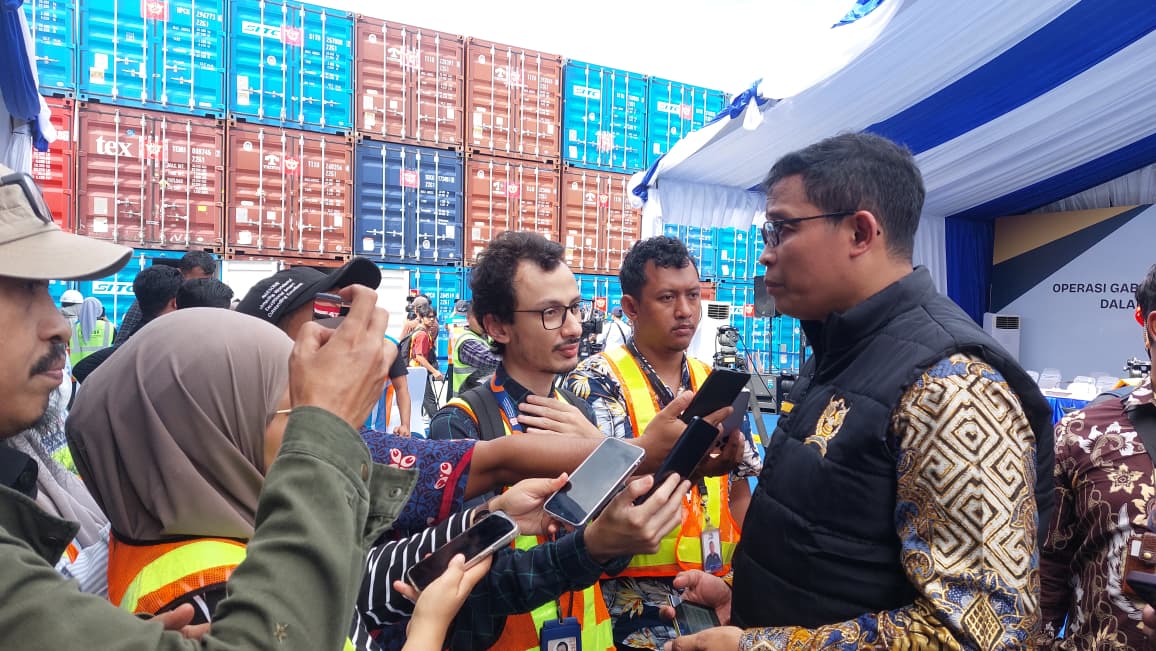 Direktur Jenderal Pajak, Bimo Wijayanto, menghadiri konferensi pers terkait pengungkapan 87 kontainer yang diduga melanggar ketentuan ekspor produk turunan minyak sawit mentah (crude palm oil/CPO). Kegiatan tersebut berlangsung di Buffer Area MTI NPCT 1, Jalan Terminal Kalibaru Raya, Cilincing, Jakarta Utara (Kamis, 6/11).
