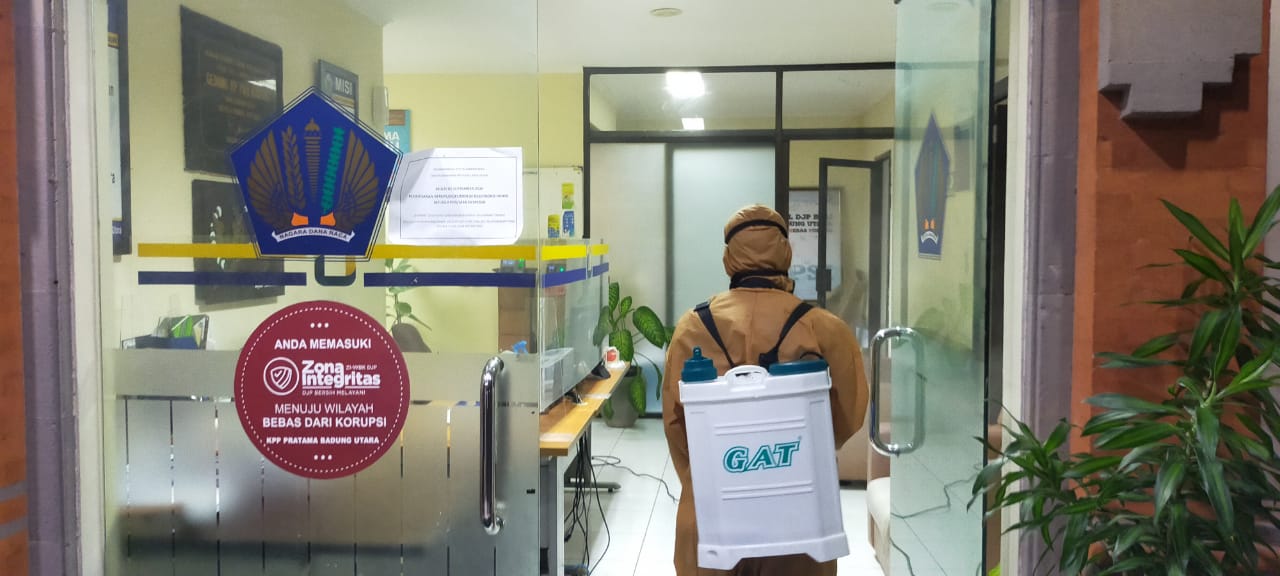Kantor Pelayanan Pajak (KPP) Pratama Badung Utara di Kota Denpasar melakukan penyemprotan desinfektan di seluruh area kantor guna melakukan antisipasi penyebaran pandemi Covid-19 (Kamis, 11/1).