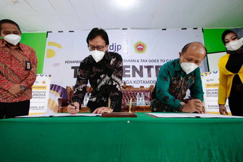 Kantor Wilayah Direktorat Jenderal Pajak Sulawesi Utara, Tengah, Gorontalo dan Maluku Utara (Kanwil DJP Suluttenggomalut) bersama Universitas Dumoga Kotamobagu melaksanakan penandatanganan kesepakatan bersama pembentukan Tax Center yang dilaksanakan di aula kampus B Universitas Dumoga Kotamobagu (Kamis, 23/9).
