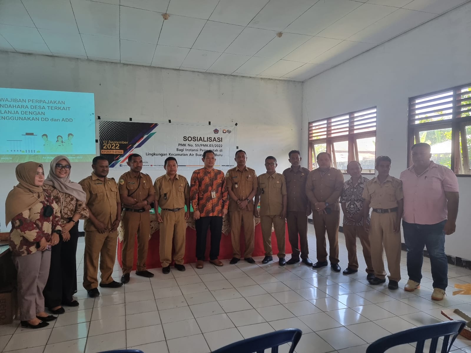 Kantor Pelayanan, Penyuluhan, dan Konsultasi Perpajakan (KP2KP) Namlea melaksanakan sosialisasi Pajak atas Dana Desa kepada seluruh desa di Kecamatan Air Buaya yang bertempat di Aula Kantor Kecamatan Air Buaya, Kabupaten Buru, Provinsi Maluku (Selasa, 13/9). Tim penyuluh KP2KP Namlea harus melakukan perjalanan selama dua jam dan menempuh jarak sekitar 100 kilometer untuk menuju Kecamatan Air Buaya.