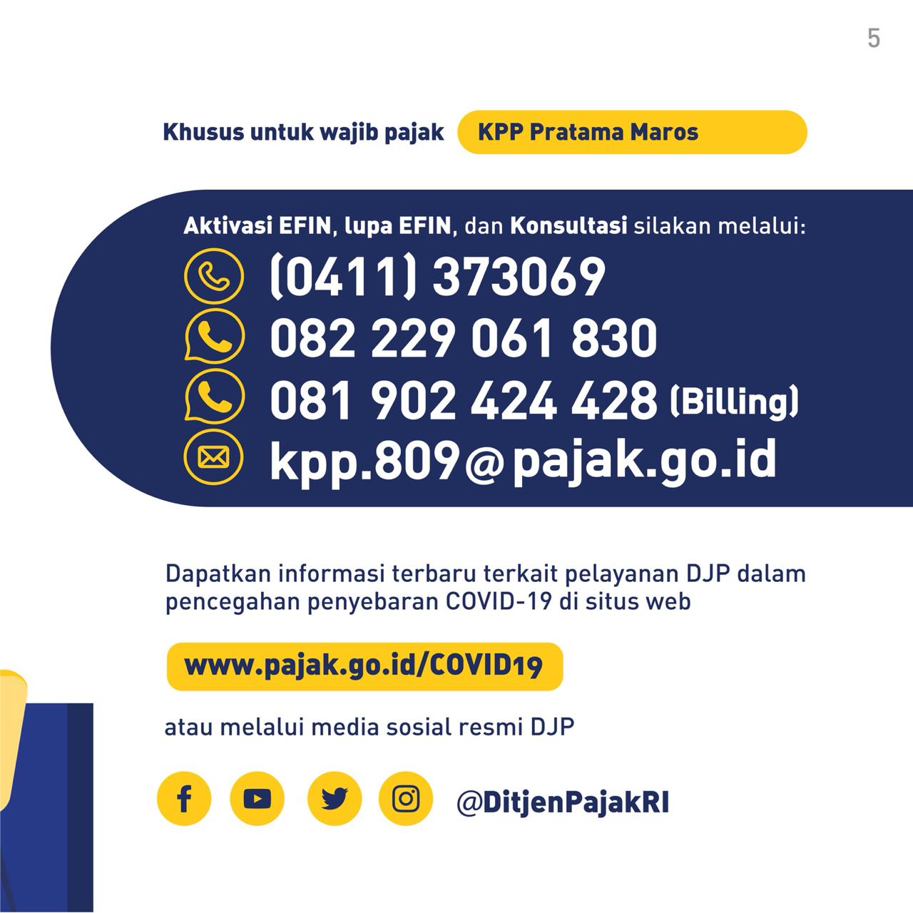Wajib Pajak bisa melakukan konsultasi perpajakan, pembuatan kode billing dan aktivasi EFIN melalui saluran yang disediakan. Untuk wajib pajak yang terdaftar di Kabupaten Maros dan Pangkajene Kepulauan dapat menghubungi 0822 2906 1830 untuk KPP Pratama Maros. Untuk KP2KP Pangkajene wajib pajak dapat menghubungi 0822 9628 9931 dan 0822 9628 9932. Untuk memperbanyak layanan, KP2KP Pangkajene menambahkan 8 nomor telepon agar wajib pajak bisa menghubungi jika terdapat keadaan darurat.