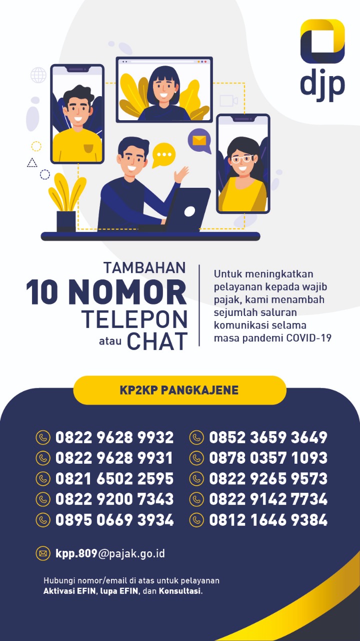 Di tengah wabah Covid-19, Kantor Pelayanan Penyuluhan dan Konsultasi Perpajakan (KP2KP) Pangkajene mengganti seluruh pelayanan tatap muka menjadi layanan secara online, hal ini pun diwujudkan dengan penambahan saluran komunikasi via telepon dan whatsapp untuk optimlanya layanan pada wajib pajak di Pangkajene (Jumat, 24/4). Upaya ini dilakukan sebagai bagian dari program Direktorat Jenderal Pajak (DJP) untuk turut serta dalam mengurangi adanya kontak langsung baik antara wajib pajak dengan pegawai maupun antarpegawai untuk mengantisipasi penyebaran Covid-19.