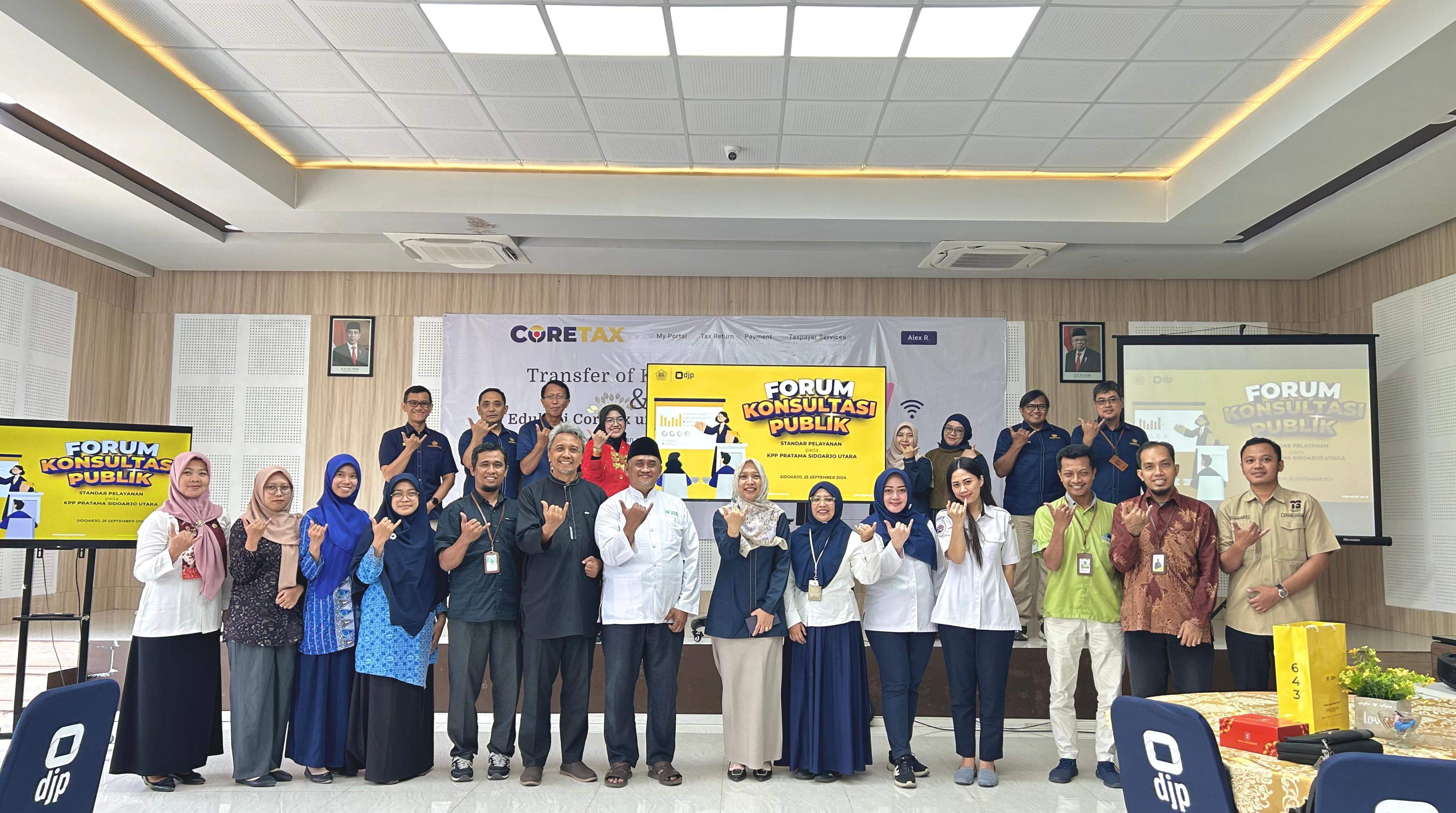 Kantor Pelayanan Pajak (KPP) Pratama Sidoarjo Utara mengadakan Forum Konsultasi Publik di Aula Buduran, Kantor Pelayanan Pajak (KPP) Pratama Sidoarjo Utara (Rabu, 25/9). Acara ini bertujuan untuk mendapatkan umpan balik atas pelayanan yang telah diberikan Direktorat Jenderal Pajak (DJP) dalam penyempurnaan Standar Pelayanan Perpajakan. Dengan kegiatan ini, diharapkan adanya peningkatan kualitas layanan melalui keterlibatan aktif publik, sesuai dengan amanat Undang-Undang Nomor 25 Tahun 2009 tentang Pelayanan Publik.