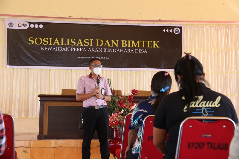 Kantor Pelayanan, Penyuluhan, dan Konsultasi Perpajakan (KP2KP) Talaud bersama Kantor Pelayanan Pajak (KPP) Pratama Tahuna mengadakan kegiatan Sosialisasi dan Bimbingan Teknis Kewajiban Perpajakan Bendahara Desa di Pendopo Rumah Dinas Bupati Kepulauan Talaud, kabupaten Kepulauan Talaud (Rabu, 18/8).