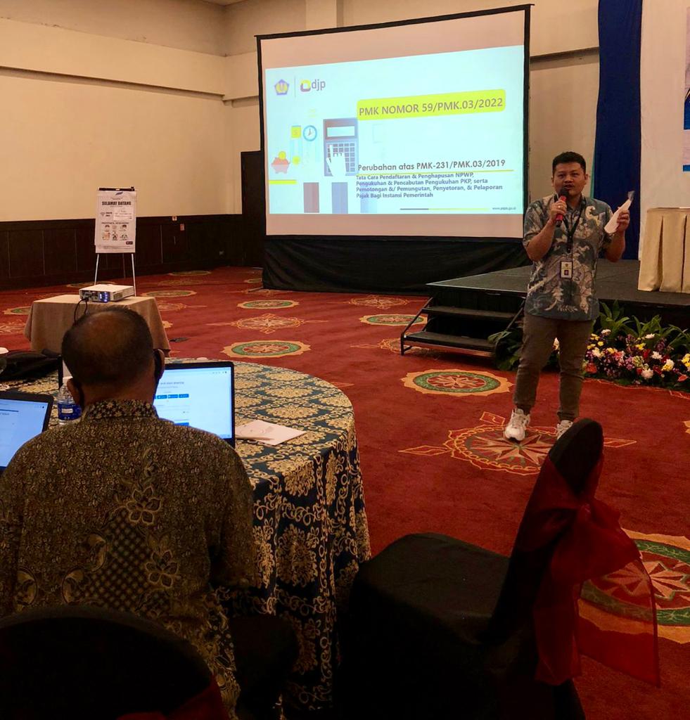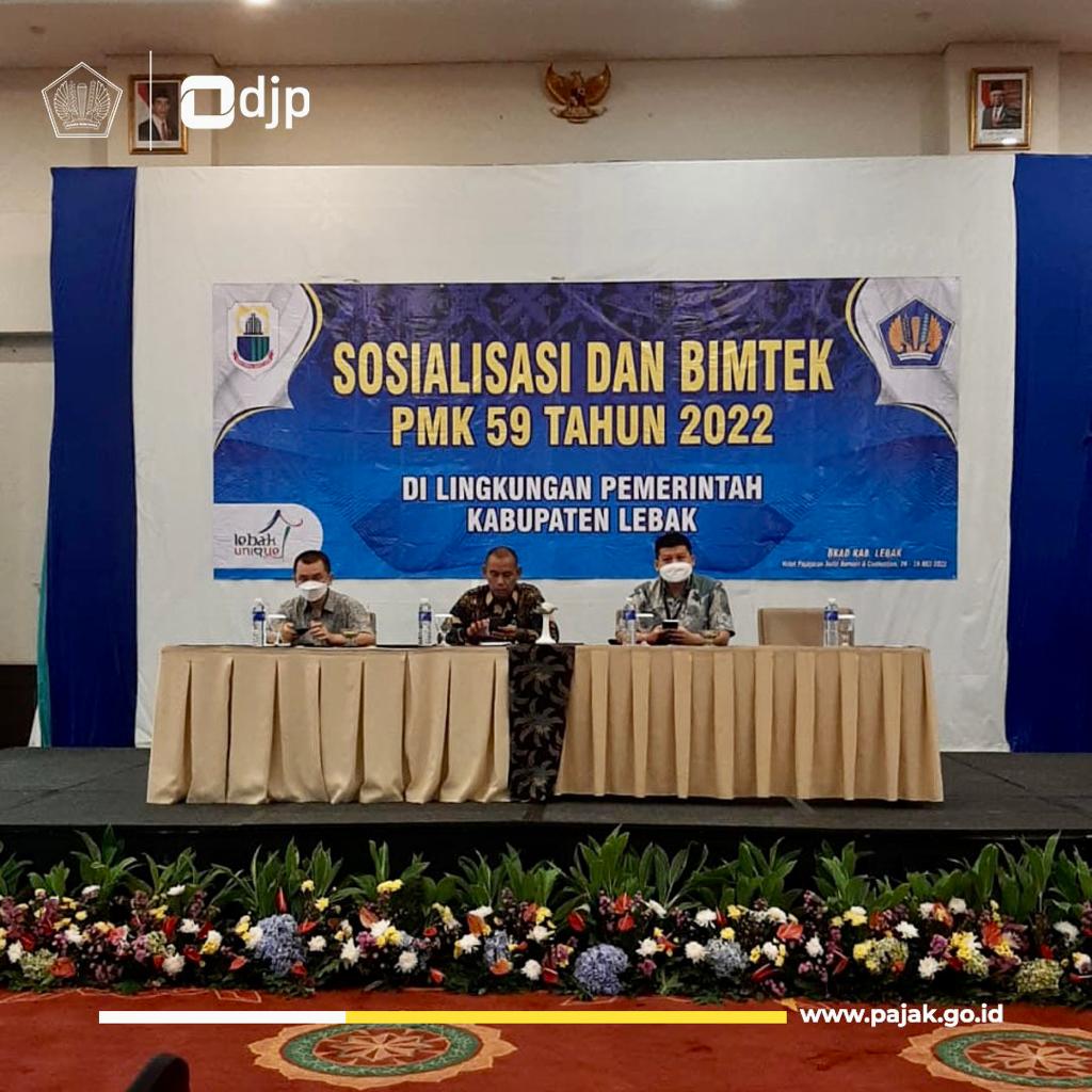 Kantor Pelayanan Pajak (KPP) Pratama Pandeglang menjadi narasumber dalam Sosialisasi dan Bimtek Peraturan Menteri Keuangan Nomor 59/PMK.03/2022 bersama Badan Keuangan dan Aset Daerah (BKAD) Kabupaten Lebak yang diikuti oleh seluruh perwakilan Instansi Pemerintah di Lingkungan Pemerintah Kabupaten Lebak yang dilangsungkan di Hotel Padjadjaran, Kota Bogor (Jumat, 27/5). Sekretaris Daerah (Sekda) Kabupaten Lebak secara resmi membuka kegiatan ini.