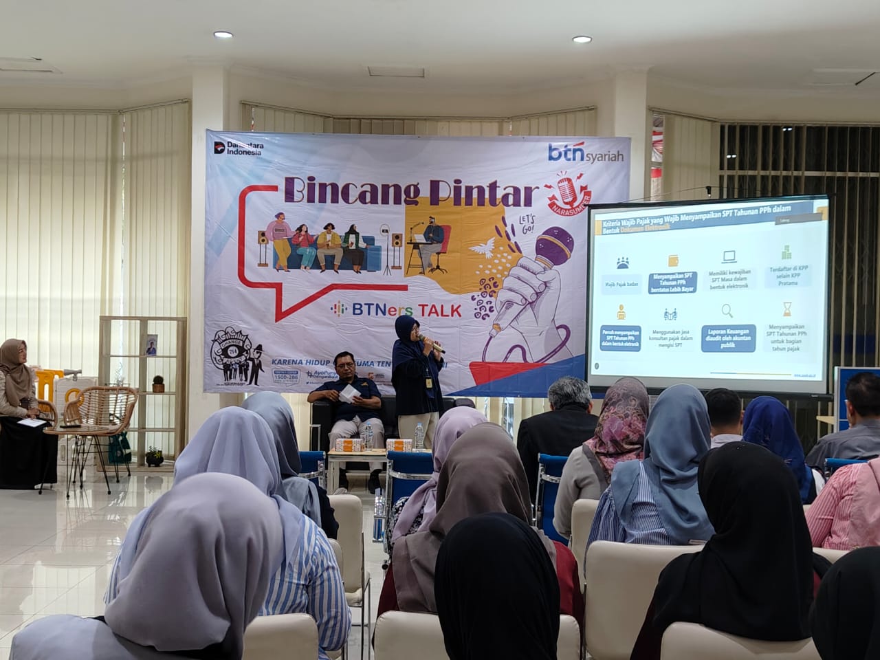 Dalam rangka meningkatkan kesadaran dan kepatuhan perpajakan, Kantor Pelayanan Pajak (KPP) Pratama Semarang Selatan memenuhi undangan untuk menjadi narasumber dalam acara sosialisasi perpajakan di Kantor Bank Tabungan Negara (BTN) Syariah Cabang Semarang, Kota Semarang (Rabu, 6/8).