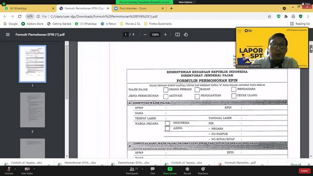 Kelas pajak ini diselenggarakan secara daring melalui aplikasi zoom meeting untuk membantu yayasan atau lembaga yang masih mengalami kesulitan dalam pelaporan SPT Tahunan PPh 1771.