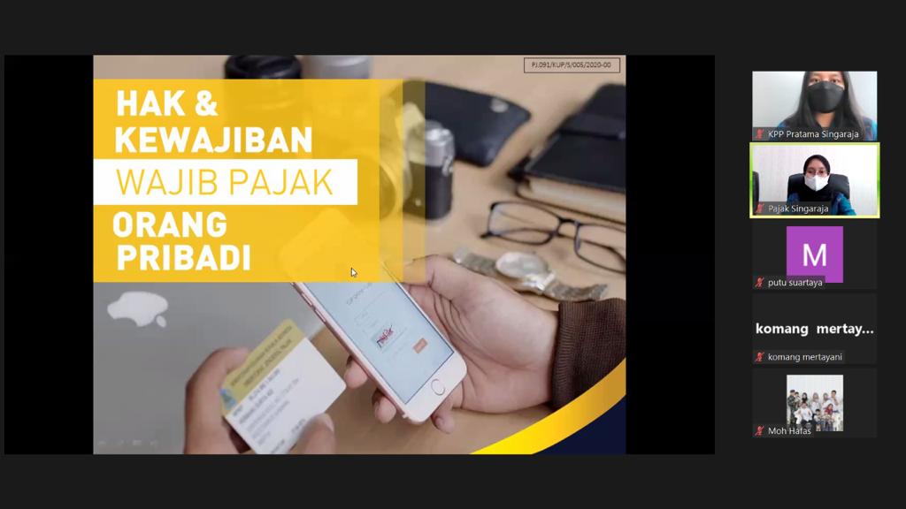 Kantor Pelayanan Pajak (KPP) Pratama Singaraja mengadakan penyuluhan kepada wajib pajak orang pribadi (WP OP) Usaha Mikro Kecil Menengah (UMKM) dengan materi Hak dan Kewajiban Perpajakan setelah memiliki Nomor Pokok Wajib Pajak (NPWP) secara daring di Kabupaten Buleleng, Bali (Selasa, 25/8).