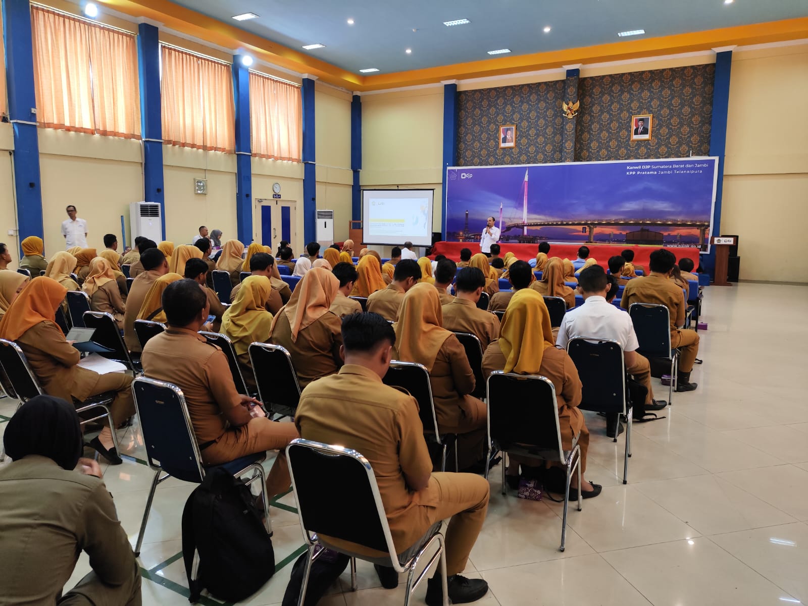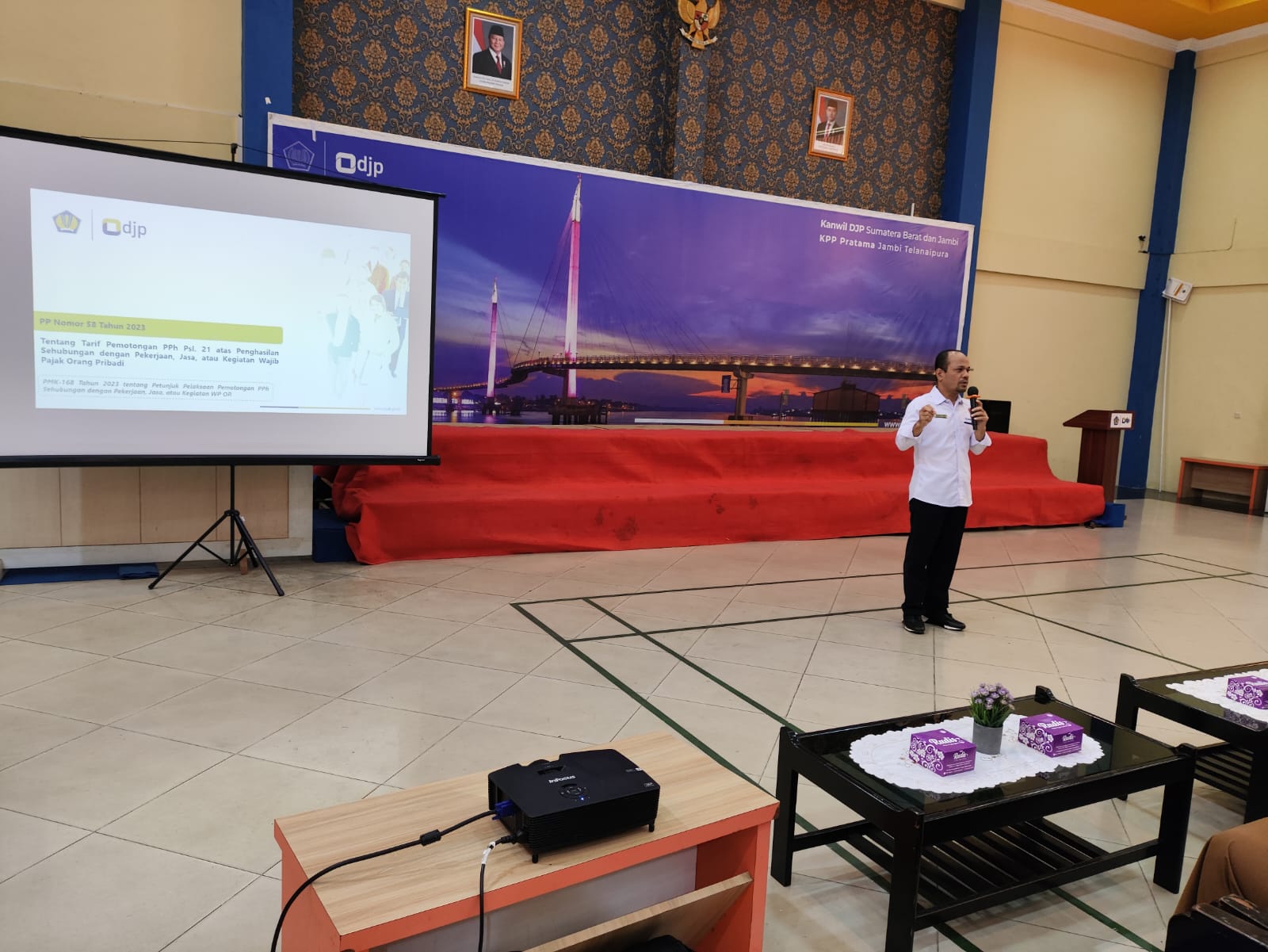 Kantor Pelayanan Pajak (KPP) Pratama Jambi Telanaipura menyelenggarakan kegiatan Sosialisasi Peraturan Pemerintah (PP) Nomor 58 tahun 2023 tentang Tarif Pemotongan Pajak Penghasilan (PPh) Pasal 21 atas Penghasilan Sehubungan dengan Pekerjaan, Jasa dan Kegiatan Wajib Pajak Orang Pribadi bagi pengelola keuangan Badan Pengelolaan Keuangan dan Aset Daerah (BPKAD) Kota Jambi. Kegiatan ini berlangsung di Aula Adhikari Danadyaksa KPP Pratama Jambi Telanaipura, Kota Jambi (Senin, 21/4).