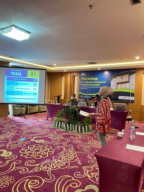 Sebanyak 25 orang Bendahara dan Pengelola Keuangan di lingkungan Universitas Islam Negeri (UIN) Sunan Gunung Djati Bandung mengikuti Lokakarya (Workshop) Peningkatan Kompetensi Pengelola Keuangan yang bertema “Implementasi Bukti Pemotongan/ Pemungutan Pajak dan SPT Masa Unifikasi Bagi Instansi Pemerintah”, di Hotel Grand Sunshine, Soreang, Kabupaten Bandung (Selasa, 16/11).