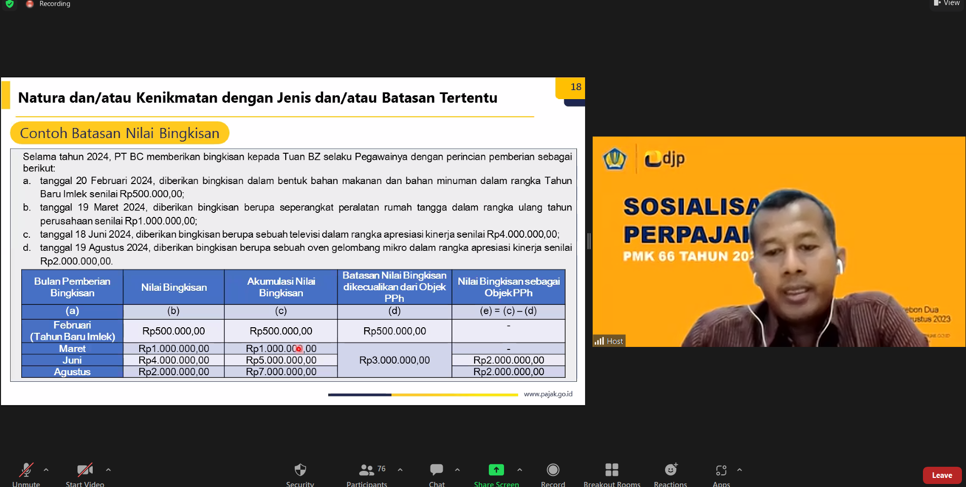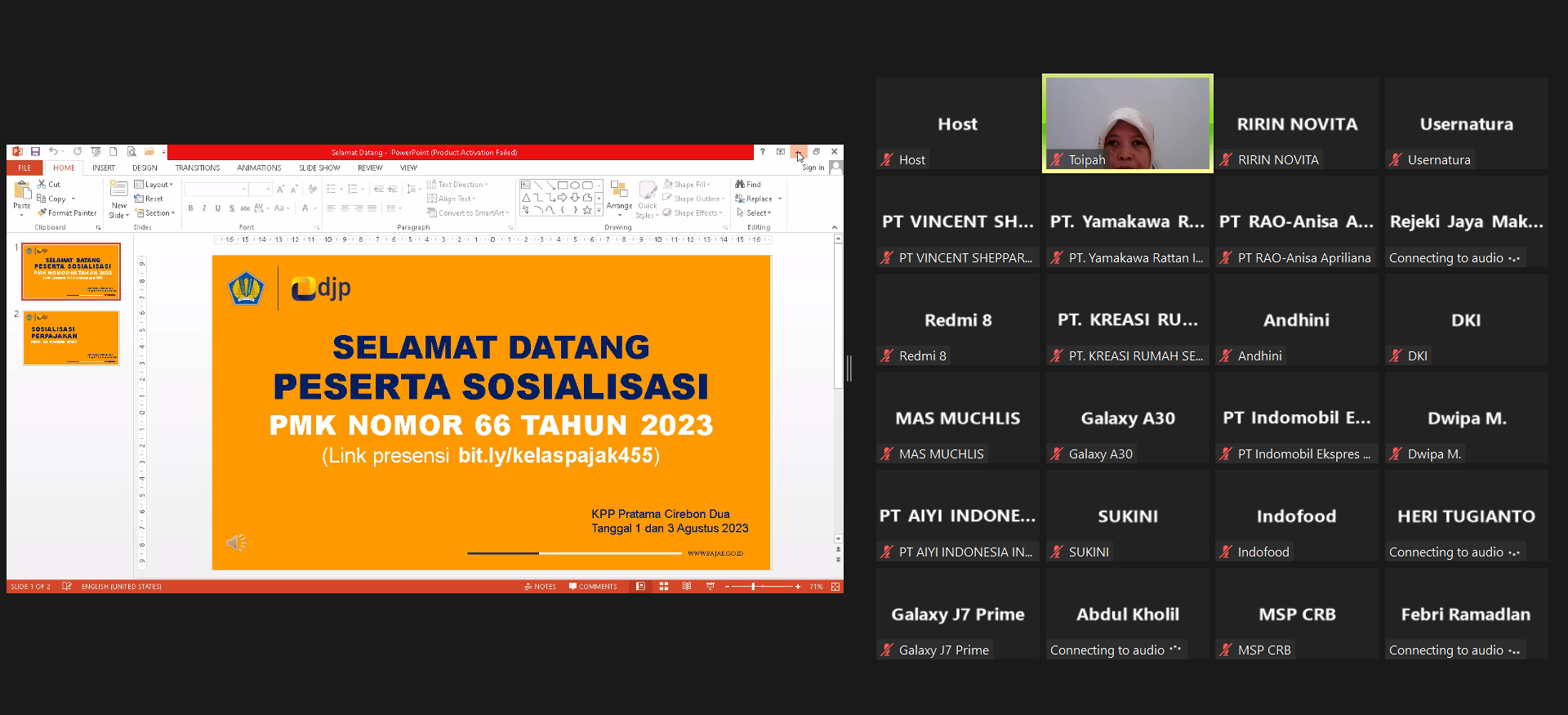 Kantor Pelayanan Pajak (KPP) Pratama Cirebon Dua mengadakan sosialisasi PMK Nomor 66 Tahun 2023 secara daring melalui media aplikasi Zoom Meeting di Cirebon, Jawa Barat (Selasa, 1/8). Sosialisasi dimulai pukul 09.00 WIB. Kegiatan ini diikuti oleh wajib pajak di wilayah Kabupaten Cirebon.